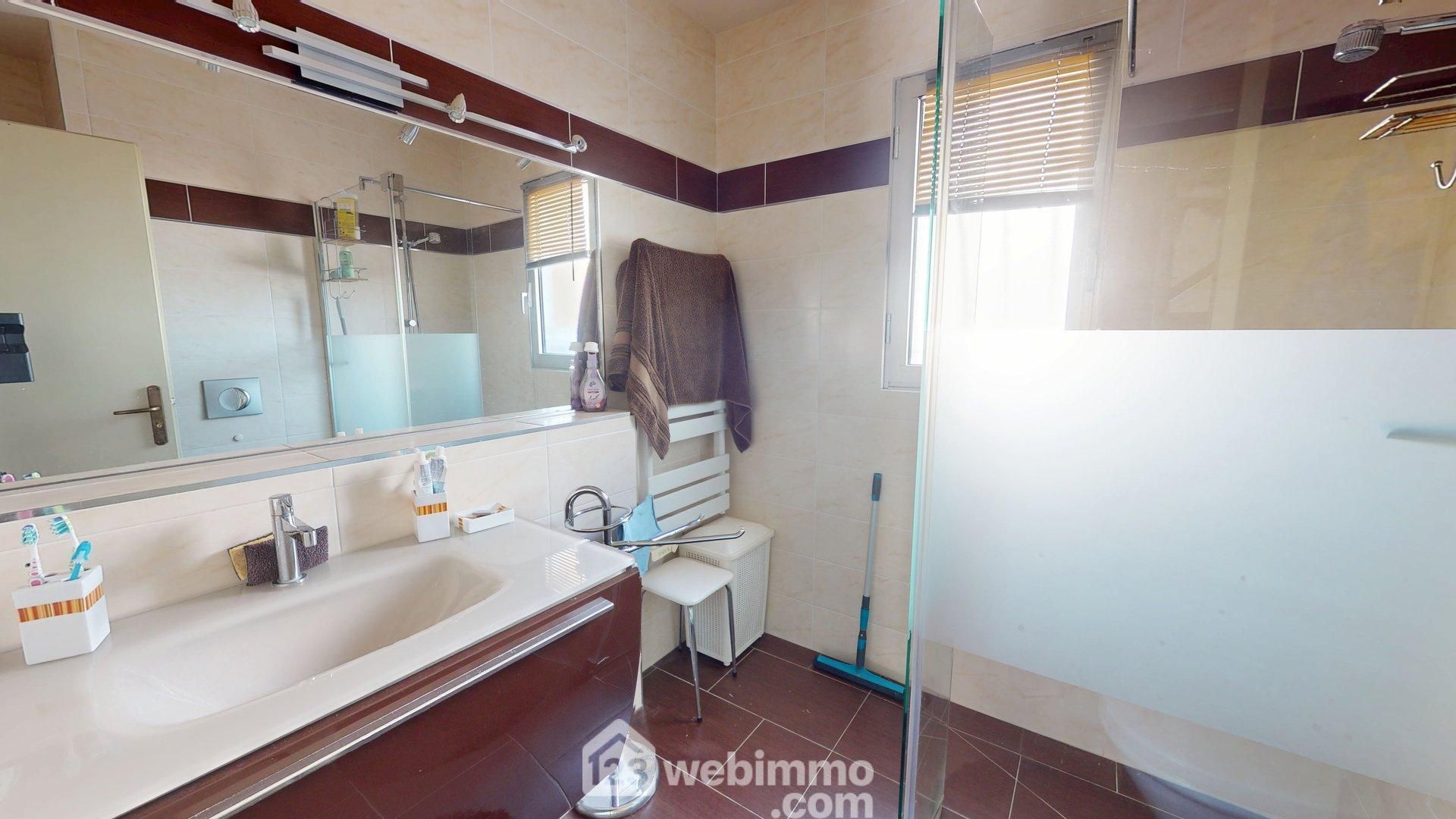 La maison comprend trois chambres, dont une avec sa salle d’eau privative (douche et vasque). Une seconde salle d’eau avec WC, moderne et bien agencée, est à disposition. L’entrée avec placard intégré et des WC séparés viennent compléter les pièces de vie.