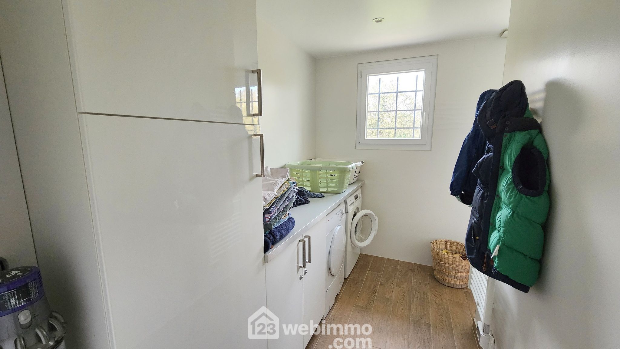 Le rez-de-chaussée, pensé pour une véritable vie de plain-pied, s’ouvre sur un sas d’entrée, suivi d’une entrée avec placard. Le séjour, chaleureux et convivial, mène à une salle à manger ouverte sur une cuisine spacieuse, aménagée et entièrement équipée, idéale pour recevoir et partager les moments du quotidien. À ce niveau, vous trouverez également une chambre avec rangements, une salle d’eau fonctionnelle dotée d’un espace buanderie, ainsi qu’un WC séparé.