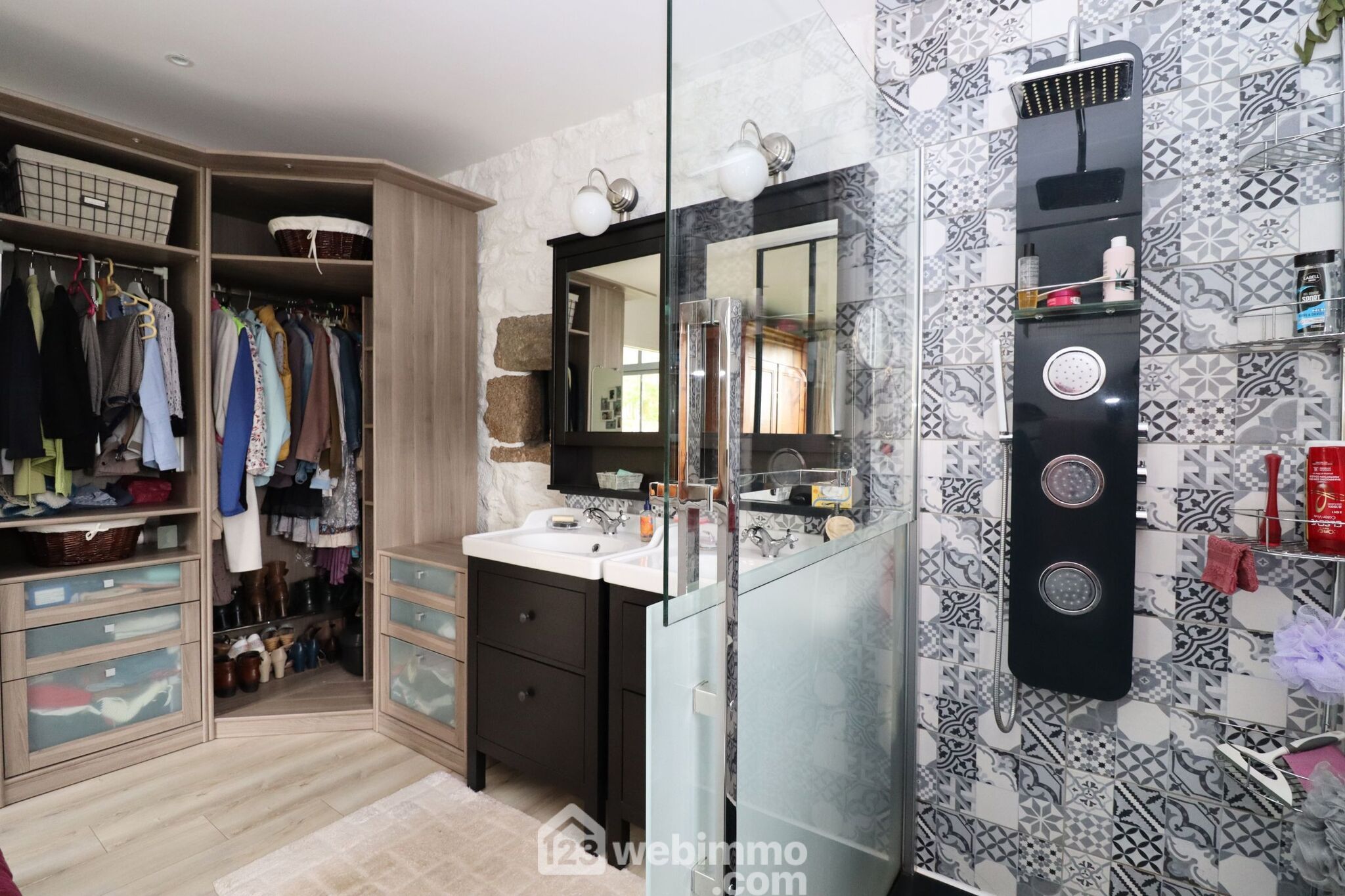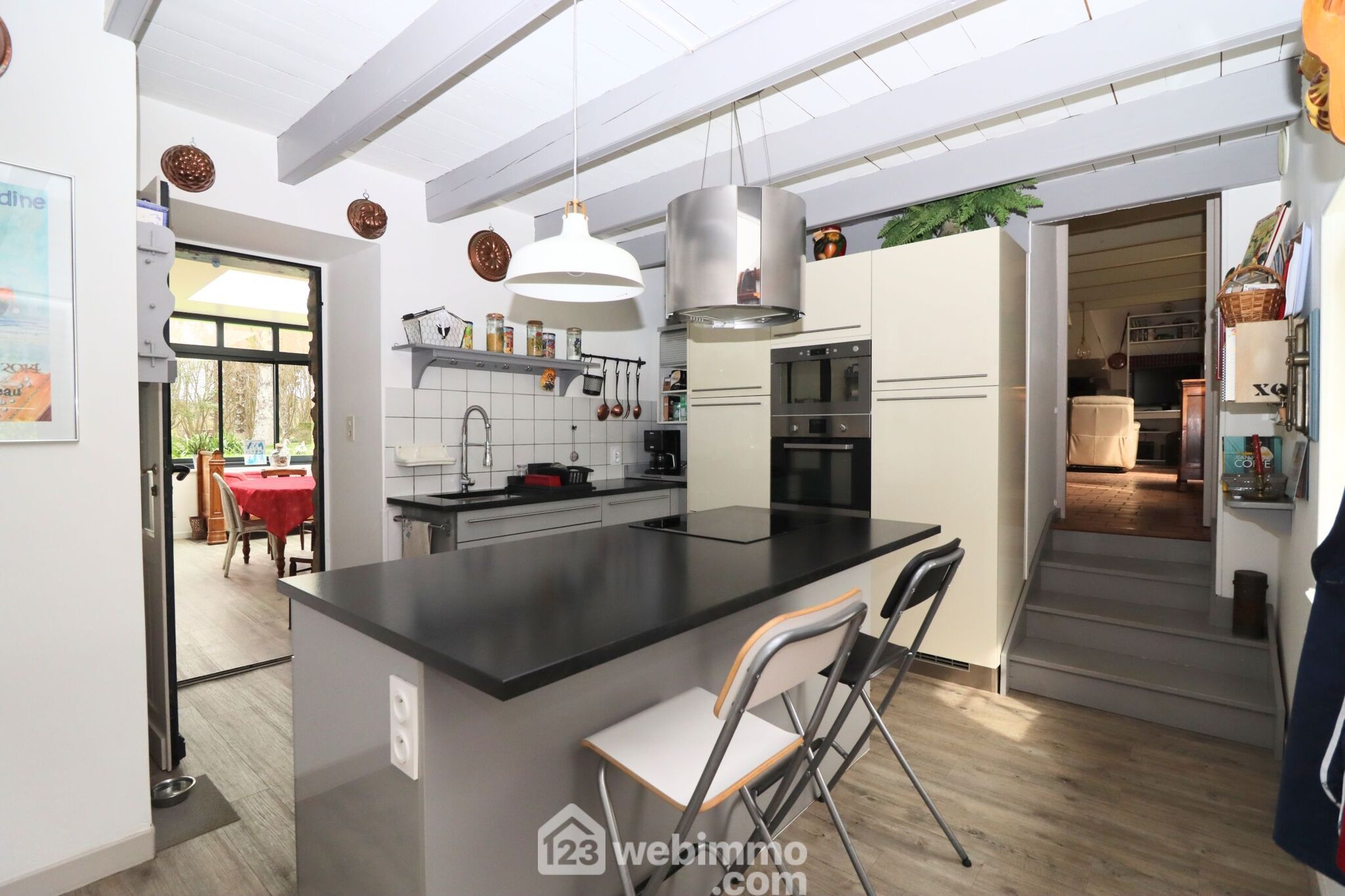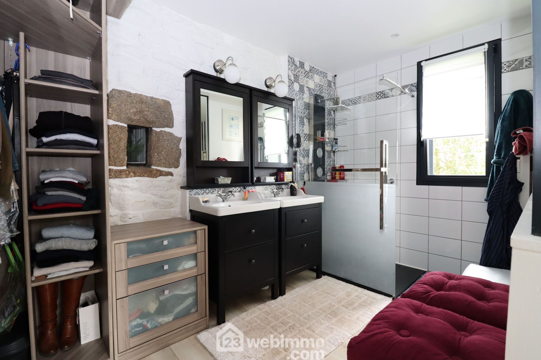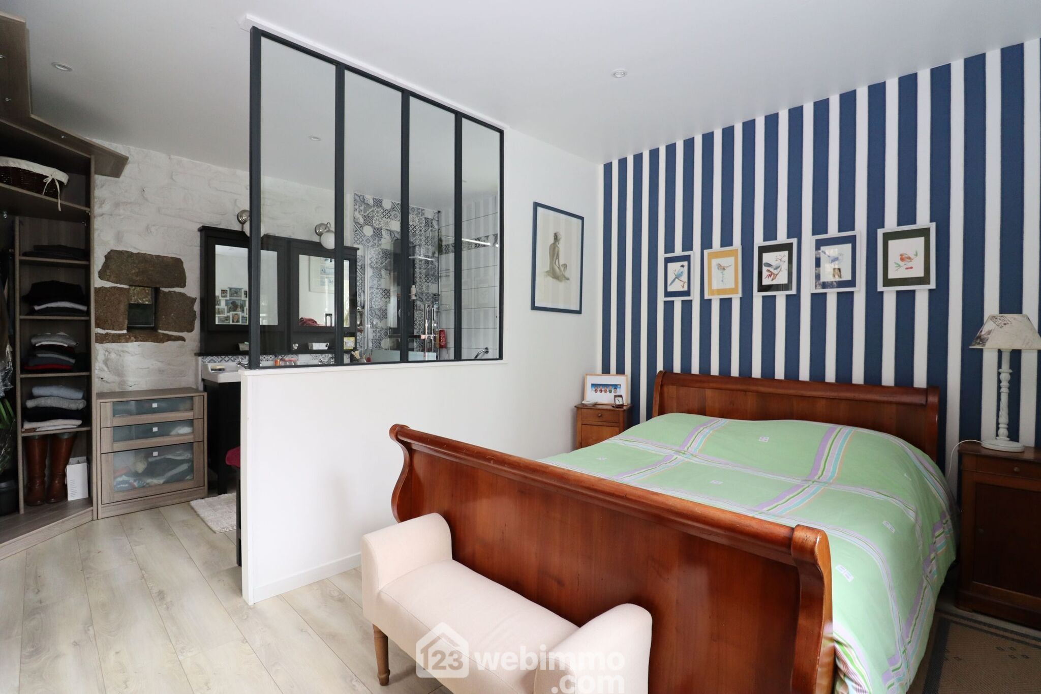 La maison édifiée en 1880, orientée plein sud, se compose au rez-de-chaussée, d'un grand salon-séjour de 42m2 avec poêle à bois, une cuisine aménagée et équipée Cuisinella de 14m2 avec plan de travail en granit noir, une arrière cuisine de 7,5m2, un WC séparé, une buanderie de 5m2 et un cellier de 8m2 disposant d'une porte de service au sud-ouest. Au nord, le rez-de-chaussée se prolonge par une belle extension moderne en rez-de-jardin de 40m2 (2015), comprenant un salon d'hiver vitré et, une suite parentale de 19m2 avec douche à l'italienne et ensemble double vasque.