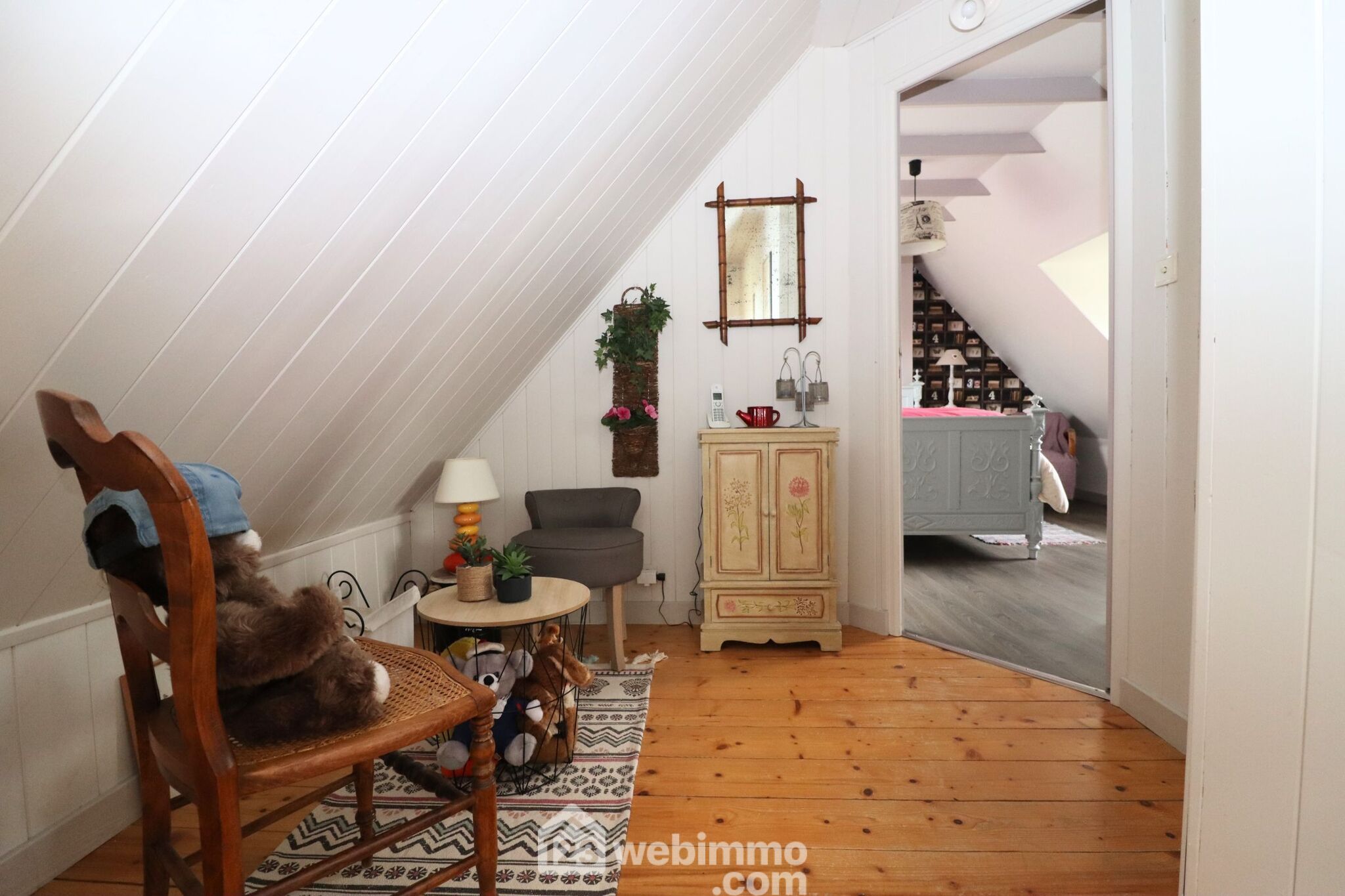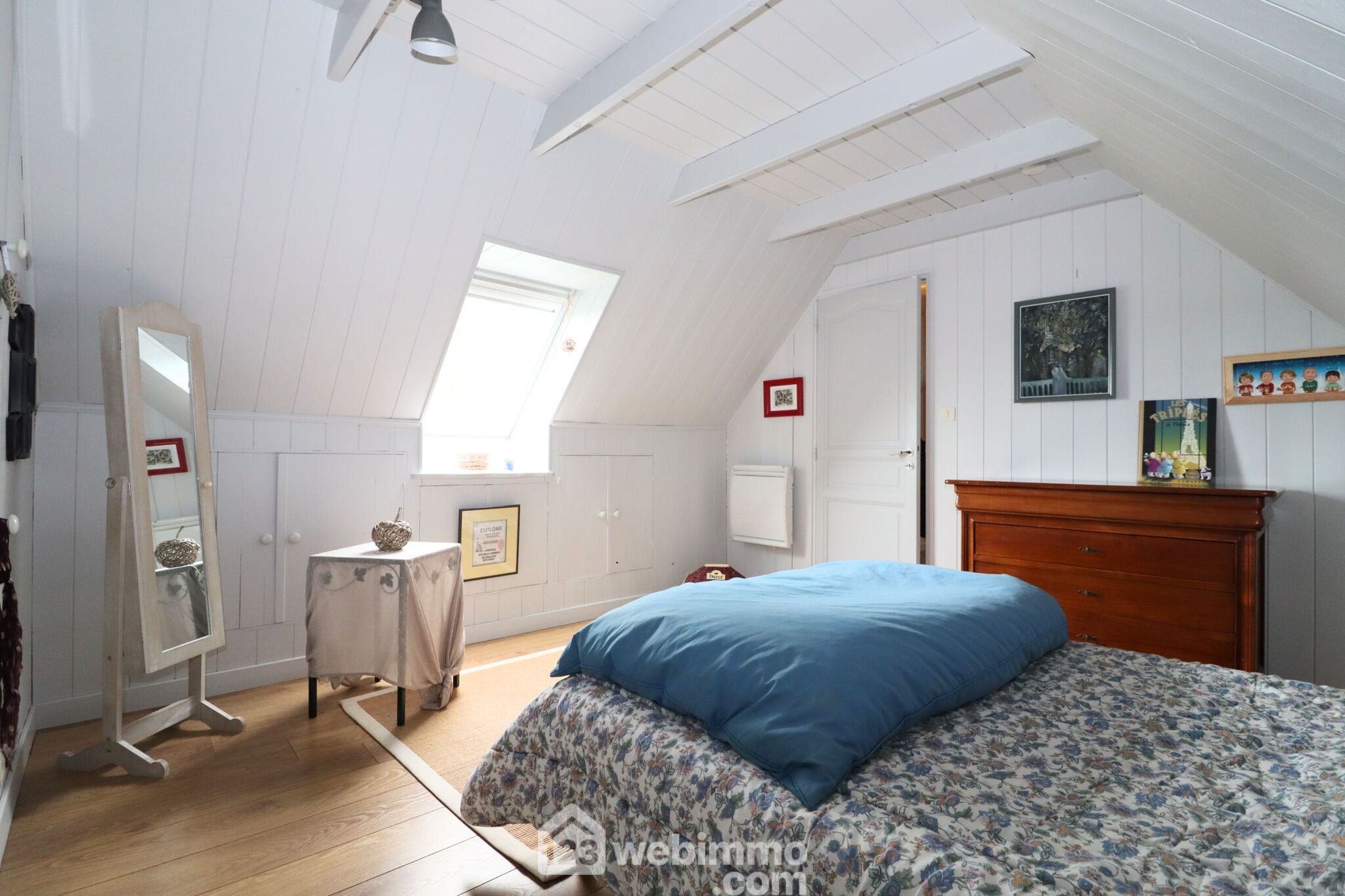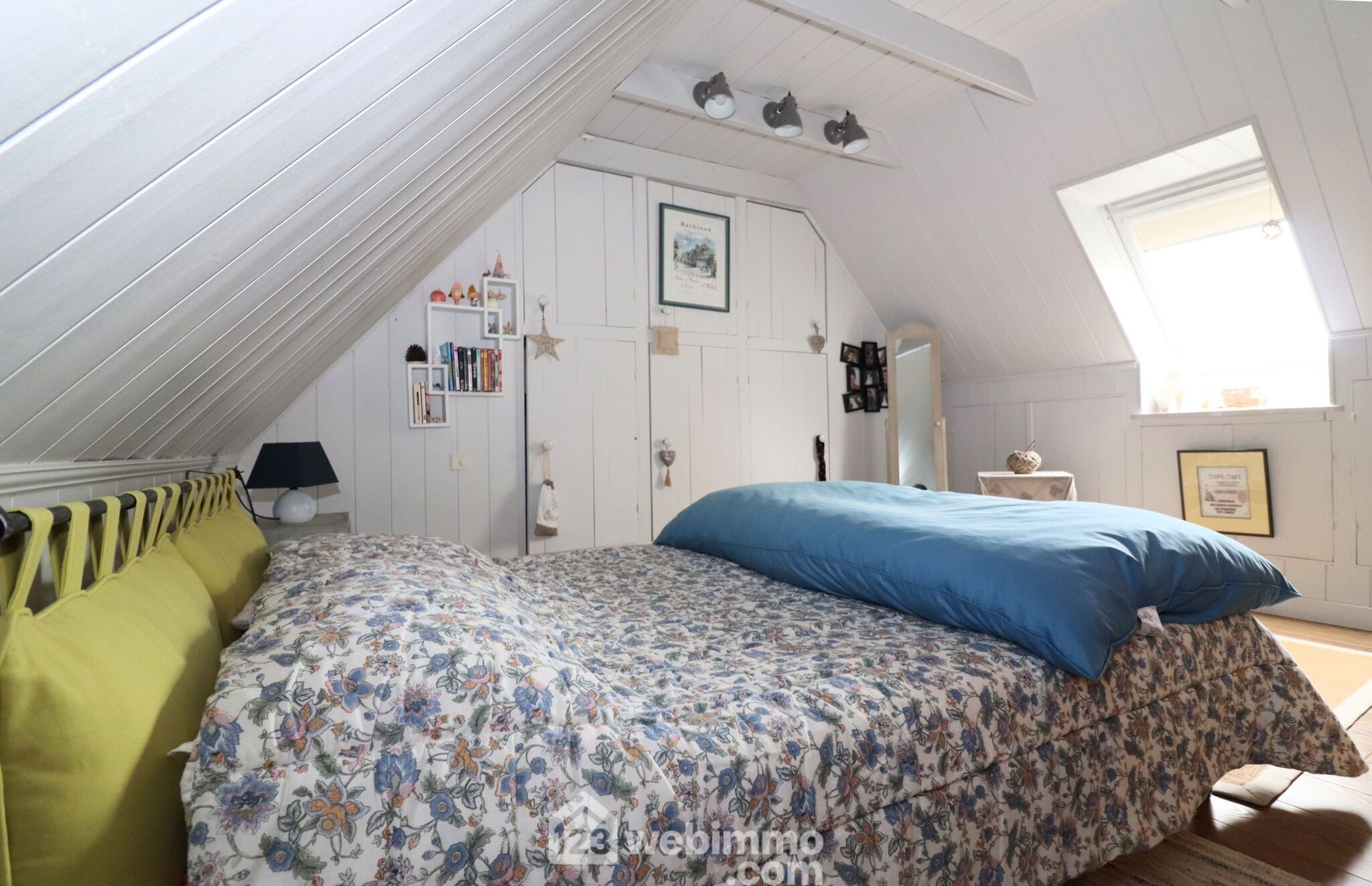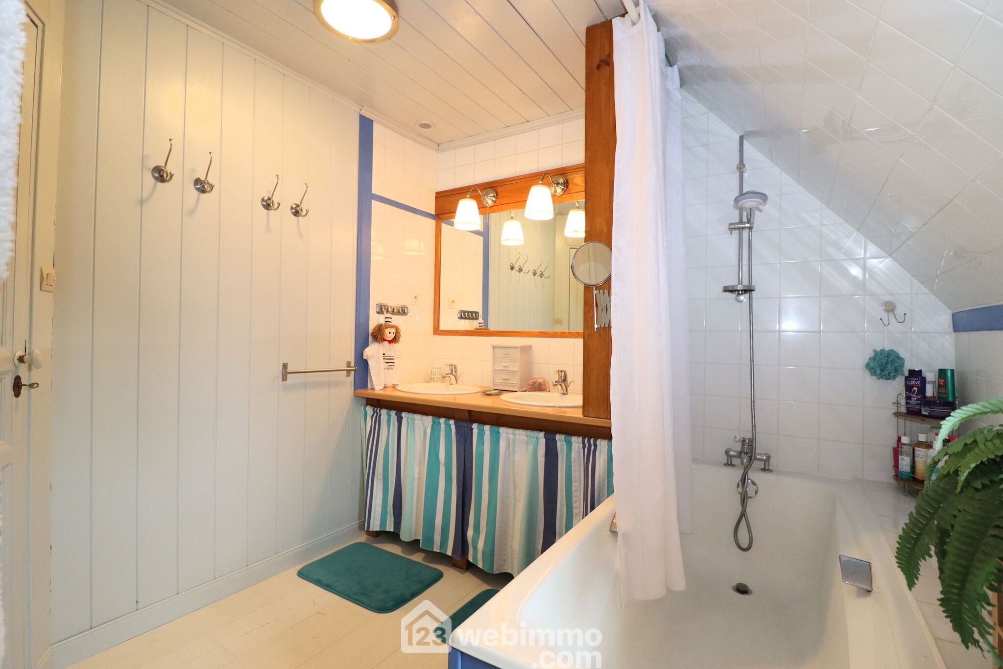A l'étage, le palier - mezzanine sur demi-niveau de 7m2 habitables, dessert 3 chambres mansardées de 11,5 à 14m2 au sol, une salle de bains de 7m2 avec meuble double vasque et un WC séparé.