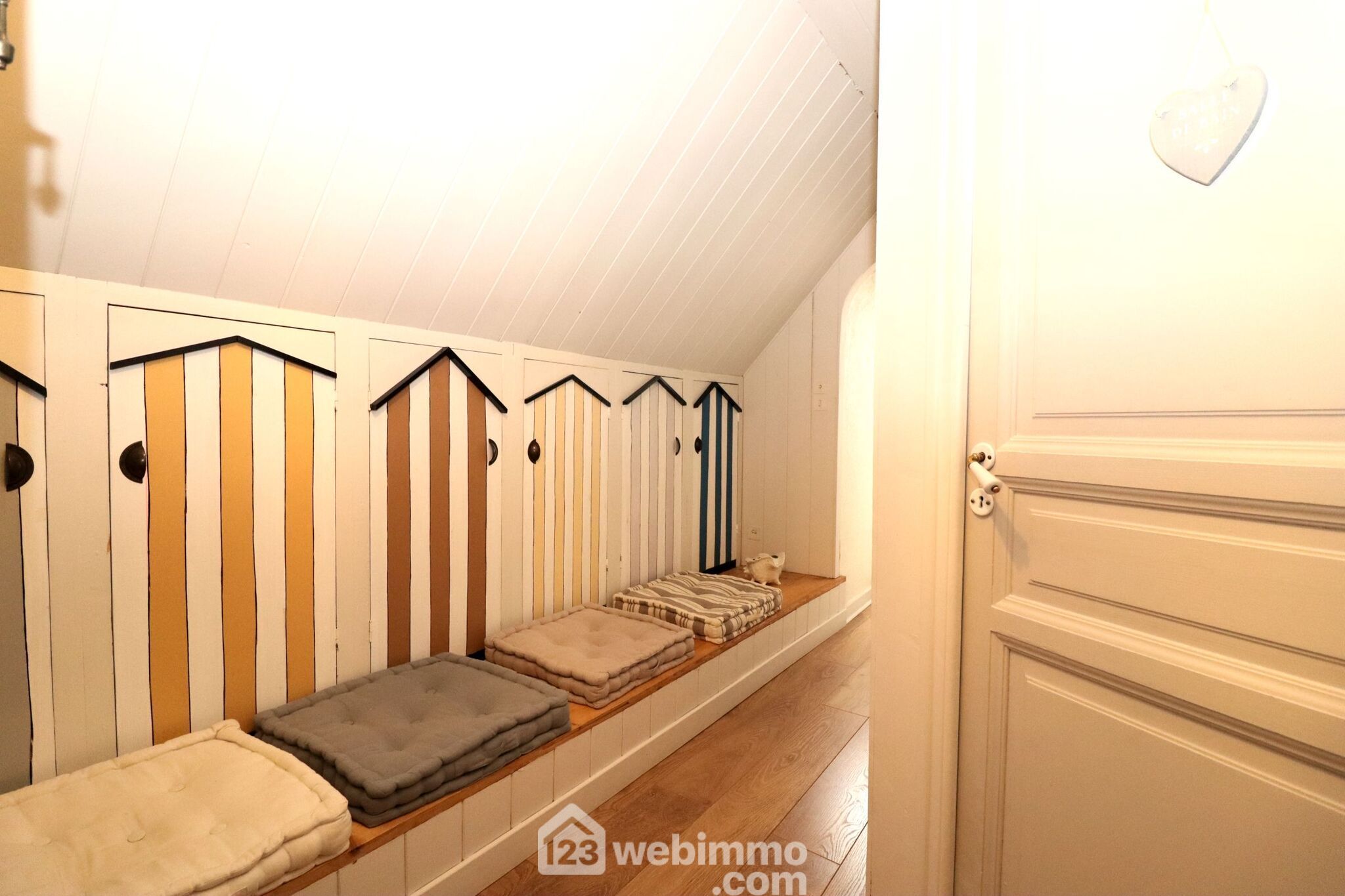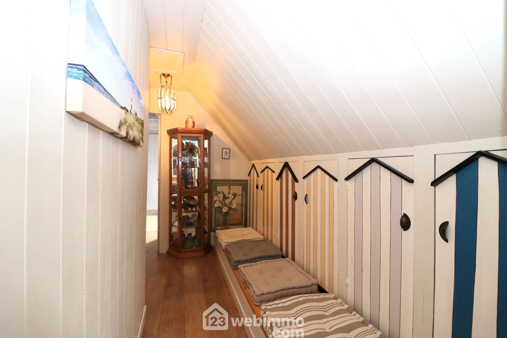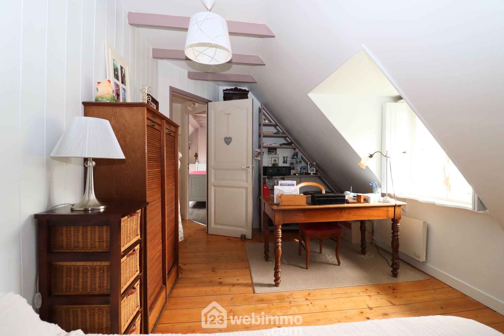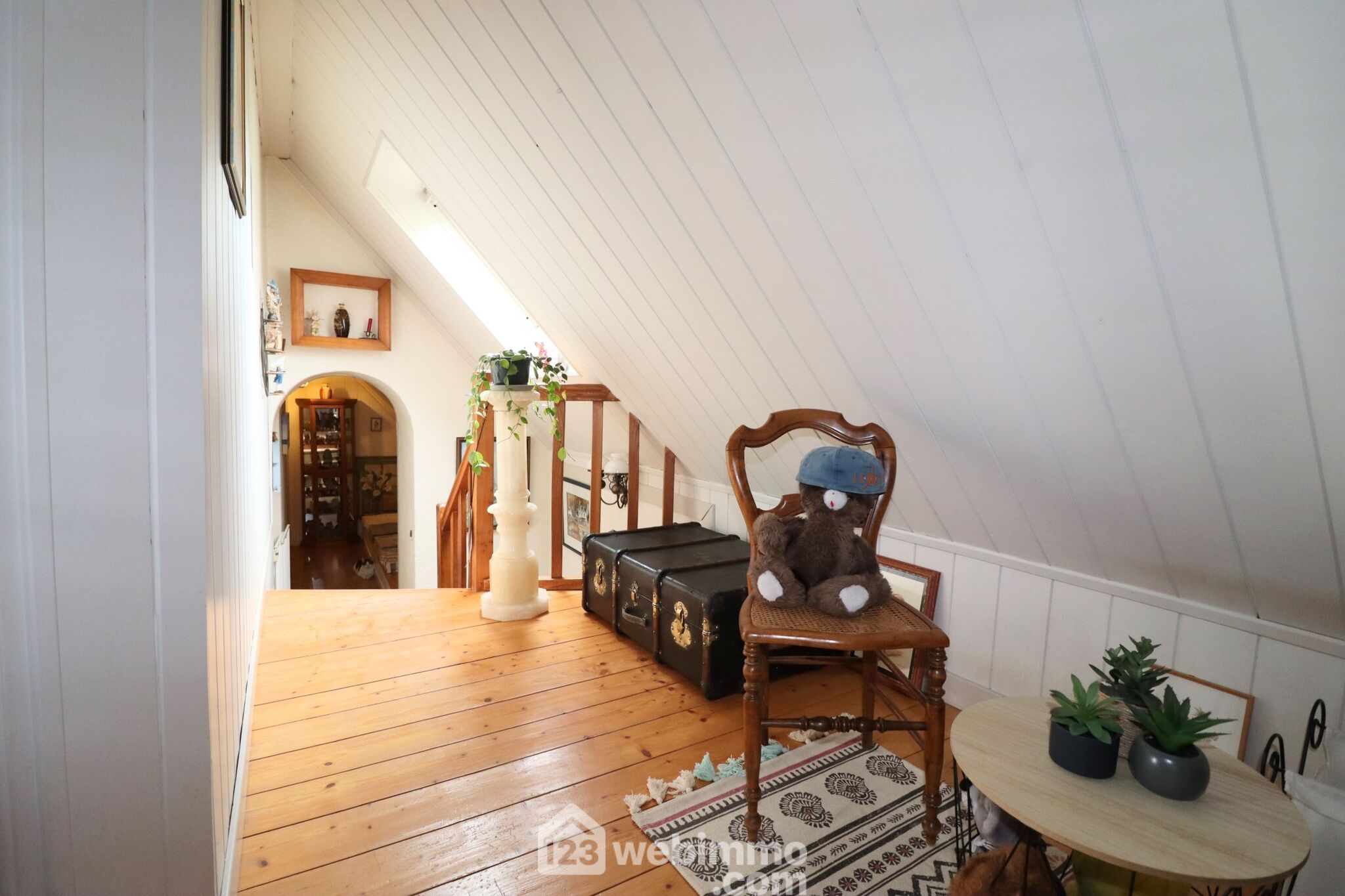 A l'étage, le palier - mezzanine sur demi-niveau de 7m2 habitables, dessert 3 chambres mansardées de 11,5 à 14m2 au sol, une salle de bains de 7m2 avec meuble double vasque et un WC séparé.