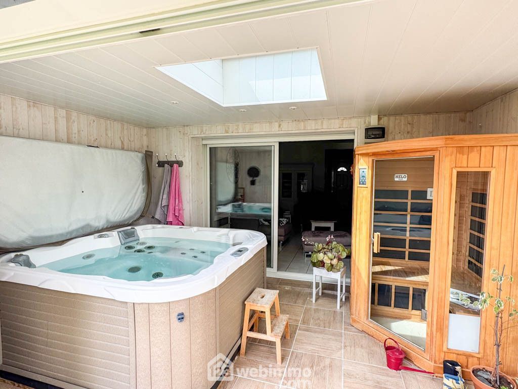 Dès l'entrée, vous serez accueilli par une agréable pièce de vie ouverte, combinant salon, salle à manger et cuisine. Depuis le salon, vous accéderez à une pièce dédiée au bien-être, équipée d'un jacuzzi et d'un sauna, parfaite pour se détendre.
