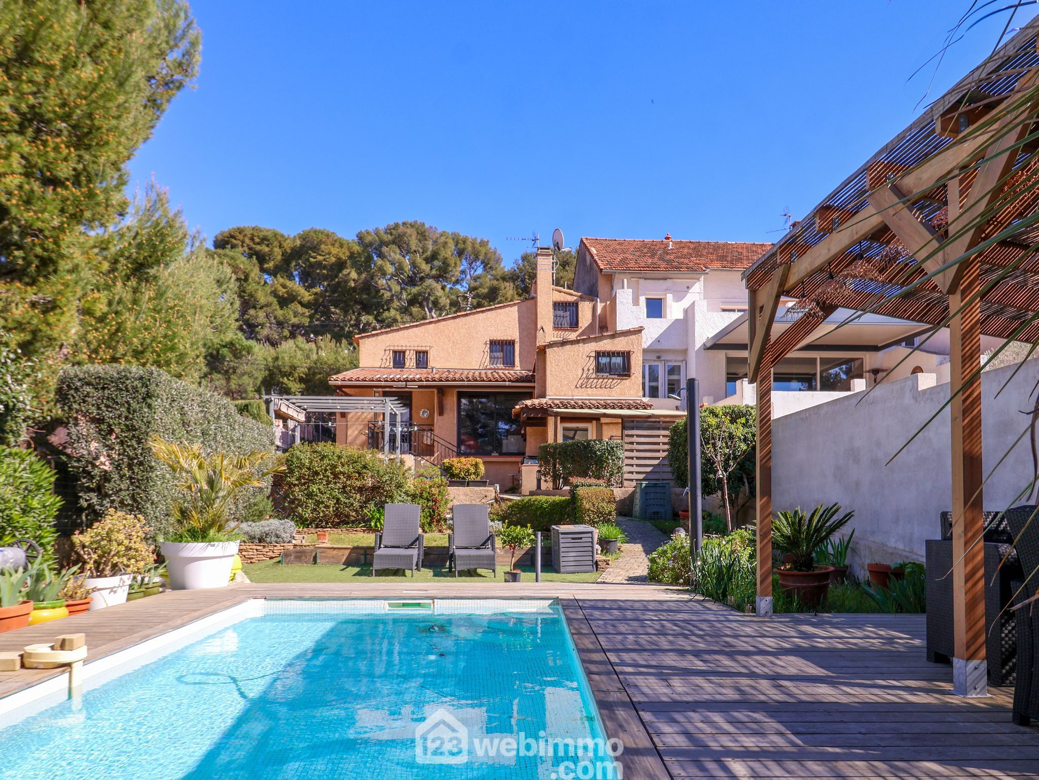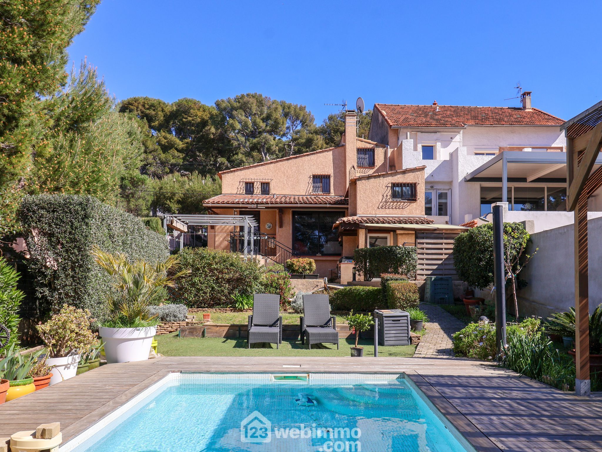 MAZARGUES. Exclusivité. Nichée dans une impasse au calme absolu dans un environnement boisé préservé, en lisière du Parc National des Calanques près de Mazargues, charmante maison avec piscine de type 5 de 147 m2. Elle propose un premier niveau offrant un séjour de 42 m2 que jouxte une cuisine ouverte sur une terrasse, une chambre avec sa salle d'eau et toilettes séparés, un bureau et une buanderie complètent ce niveau. À l’étage se trouvent deux chambres se partageant une salle d'eau et un toilette. Une quatrième chambre enrichit la partie nuit. Le jardin baigné de soleil permet de profiter d’une piscine maçonnée accompagnée d’un salon extérieur, un vaste atelier de 17 m2 complète l’ensemble. Une cuisine d'été fermée apporte un confort supplémentaire. Climatisation réversible dans toute l’habitation, menuiseries aluminium. Une cave en sous-sol de 16 m2 offre un bel espace de stockage. Stationnement aisée dans la rue. Ecole élémentaire Vaccaro, collège Grande Bastide. Les informations sur les risques auxquels ce bien est exposé sont consultables sur le site Géorisques : www.georisques.gouv.fr.