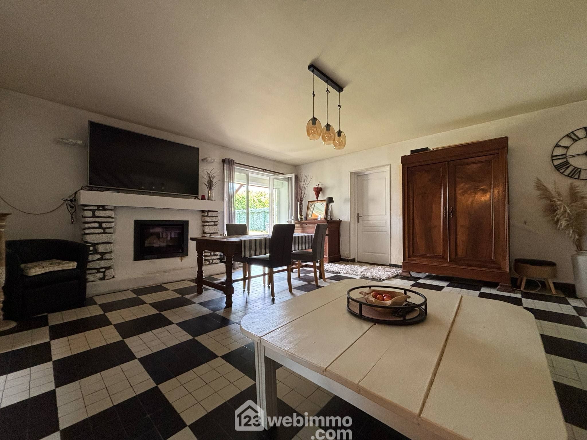 - En face, dans le bâti d'origine construit dans les années 60, la cuisine indépendante aménagée, le séjour avec cheminée avec accès à la terrasse/patio, la salle de bain de 11 m2 récemment rénovée et un WC indépendant.