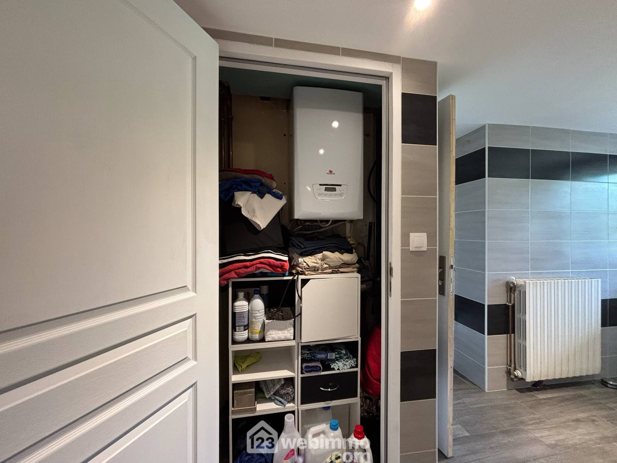 Menuiseries PVC en double vitrage sur presque toute la maison sauf deux fenêtres en bois en double vitrage, chauffage central gaz (GPL), assainissement individuel.