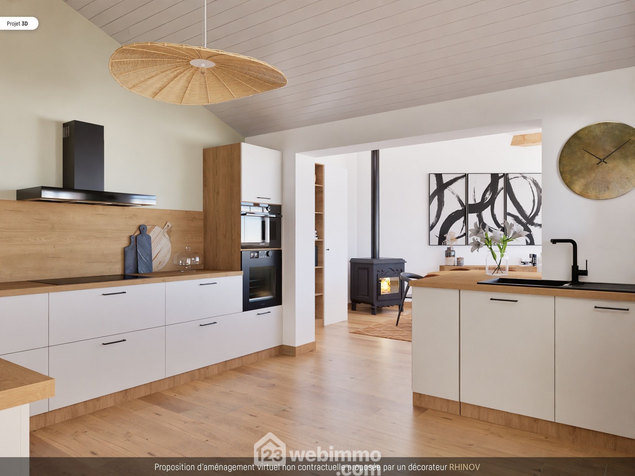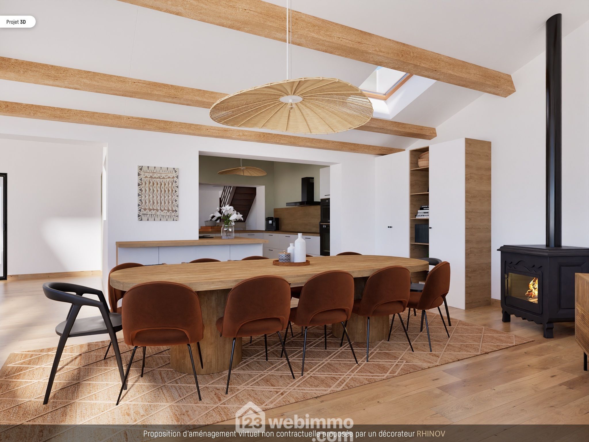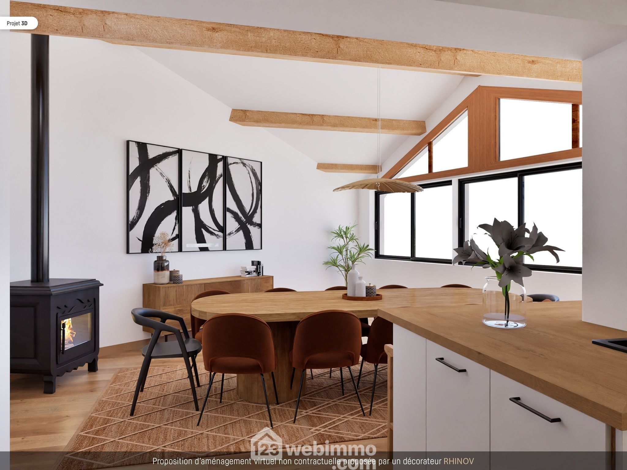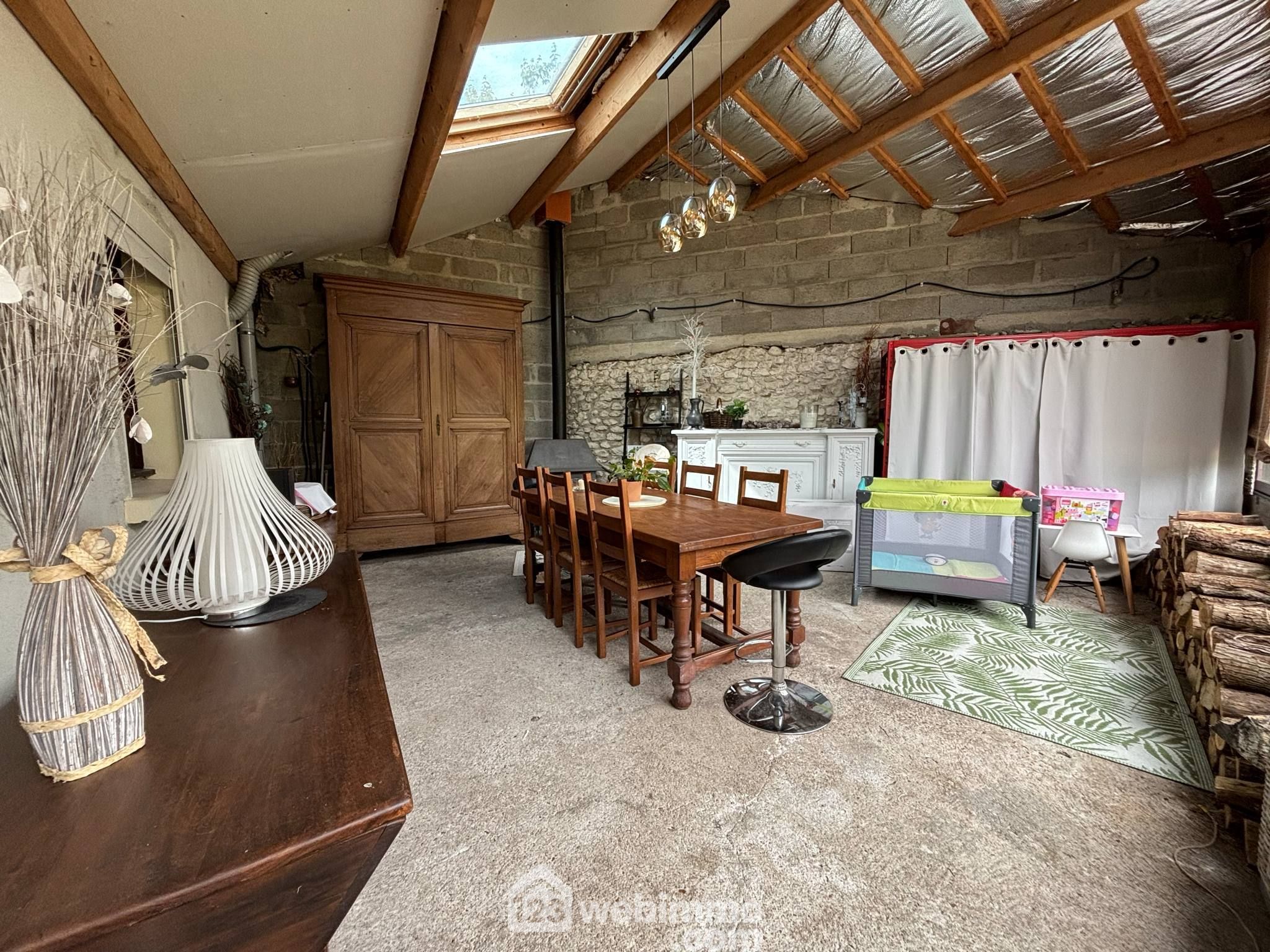 - A droite, une pièce de vie de 50 m2 avec de grandes baies vitrées et équipée d'un poêle à bois,