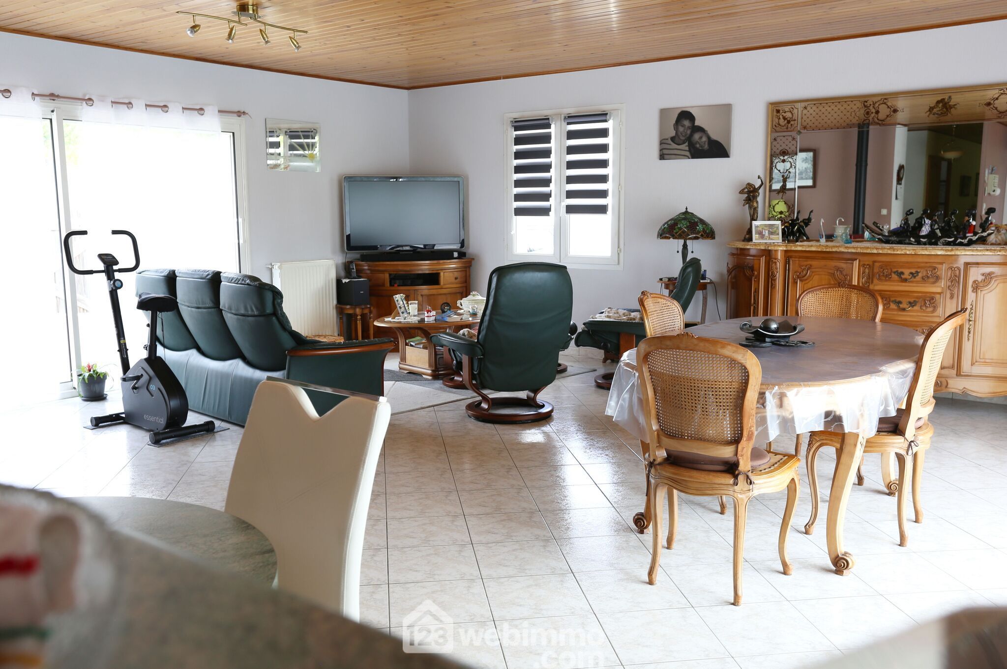 De plain-pied, elle se compose d'une spacieuse pièce de vie traversante d'environ 55 m² avec sa cuisine américaine, cellier.