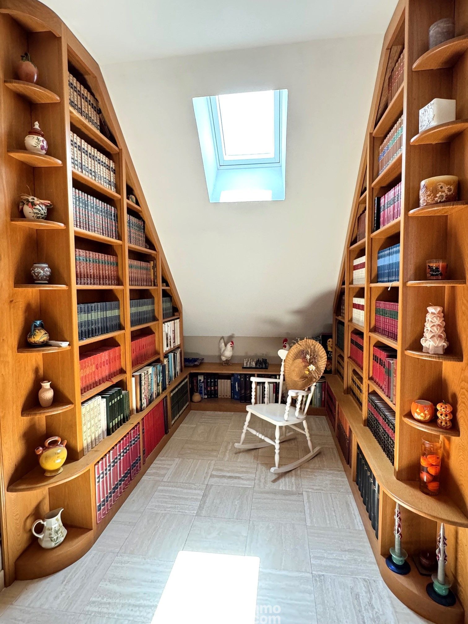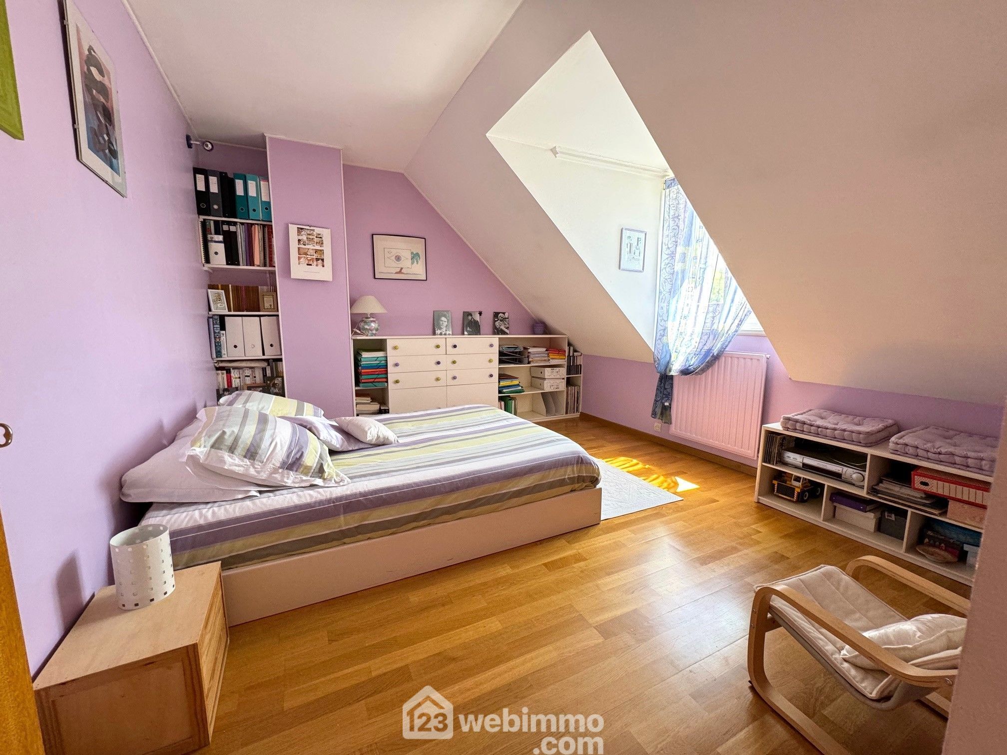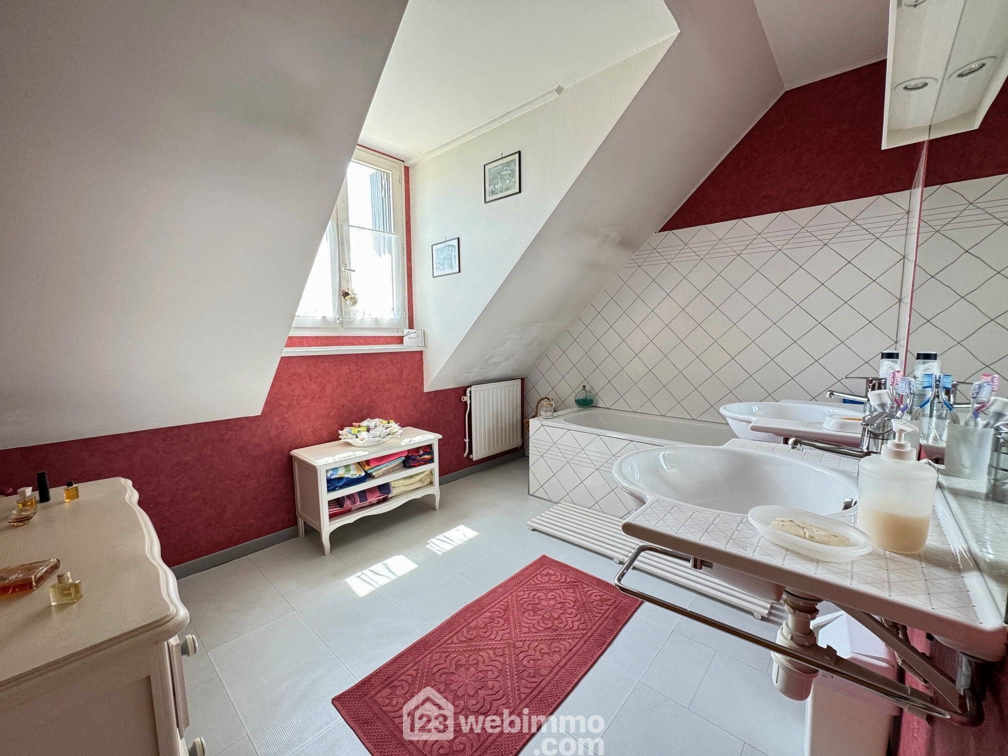 A l'étage: Un palier agrémenté d'une bibliothéque sur mesure dessert trois autres chambres, dont une équipée de rangements intégrés. Pour le divertissement des enfants ou pour un espace de loisirs, une pièce supplémentaire se trouve au-dessus du garage. Une salle de bains et un wc indépendant complète l'étage.
