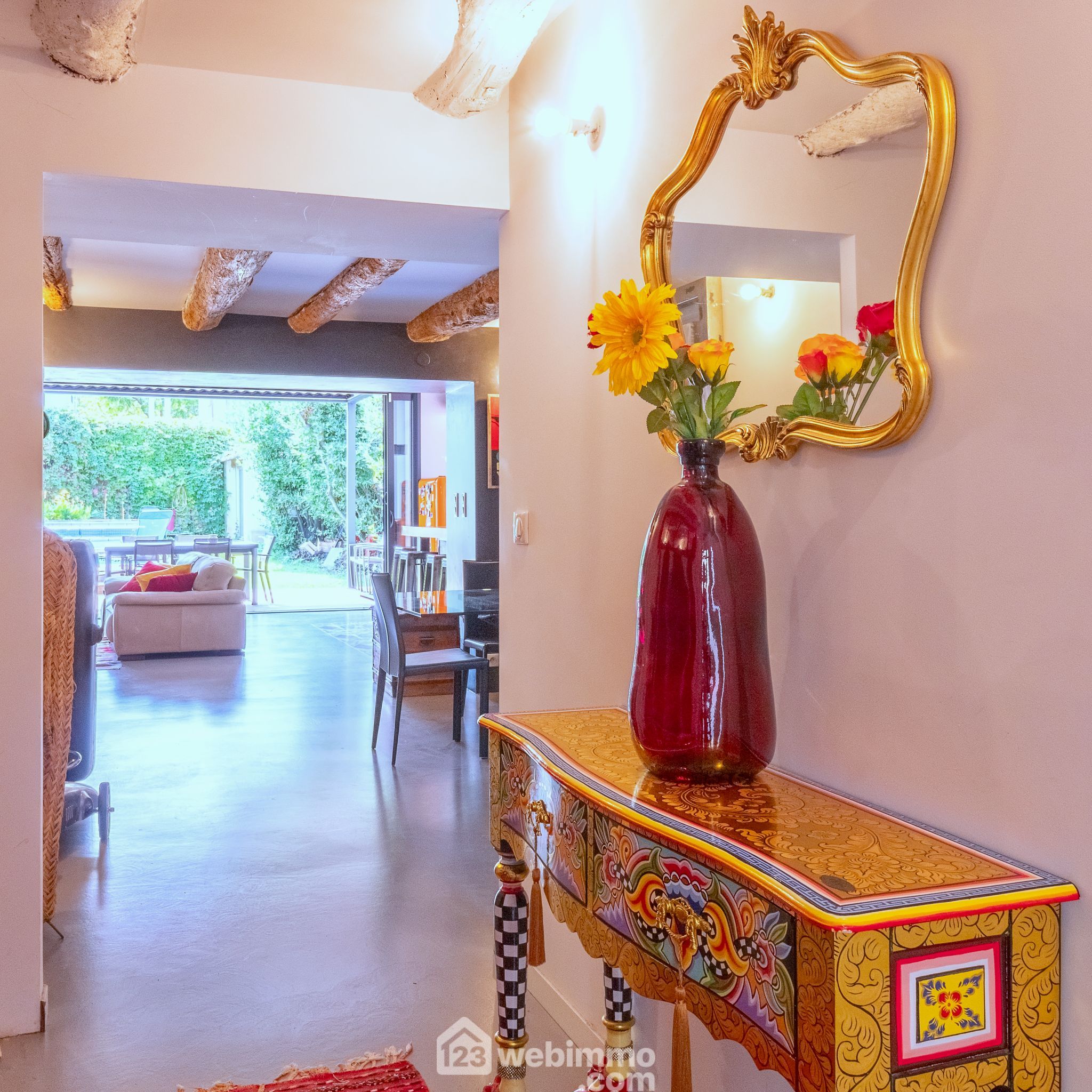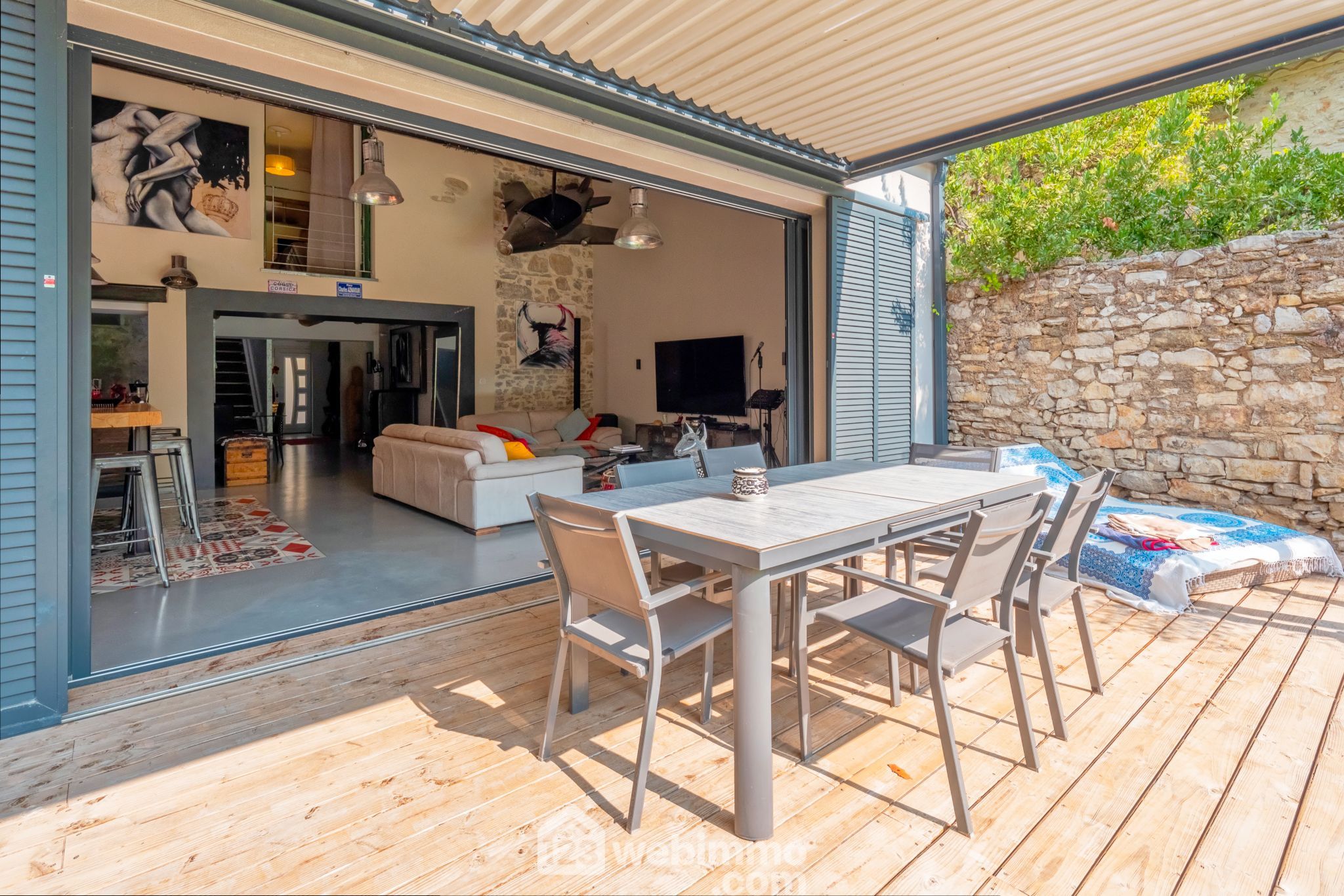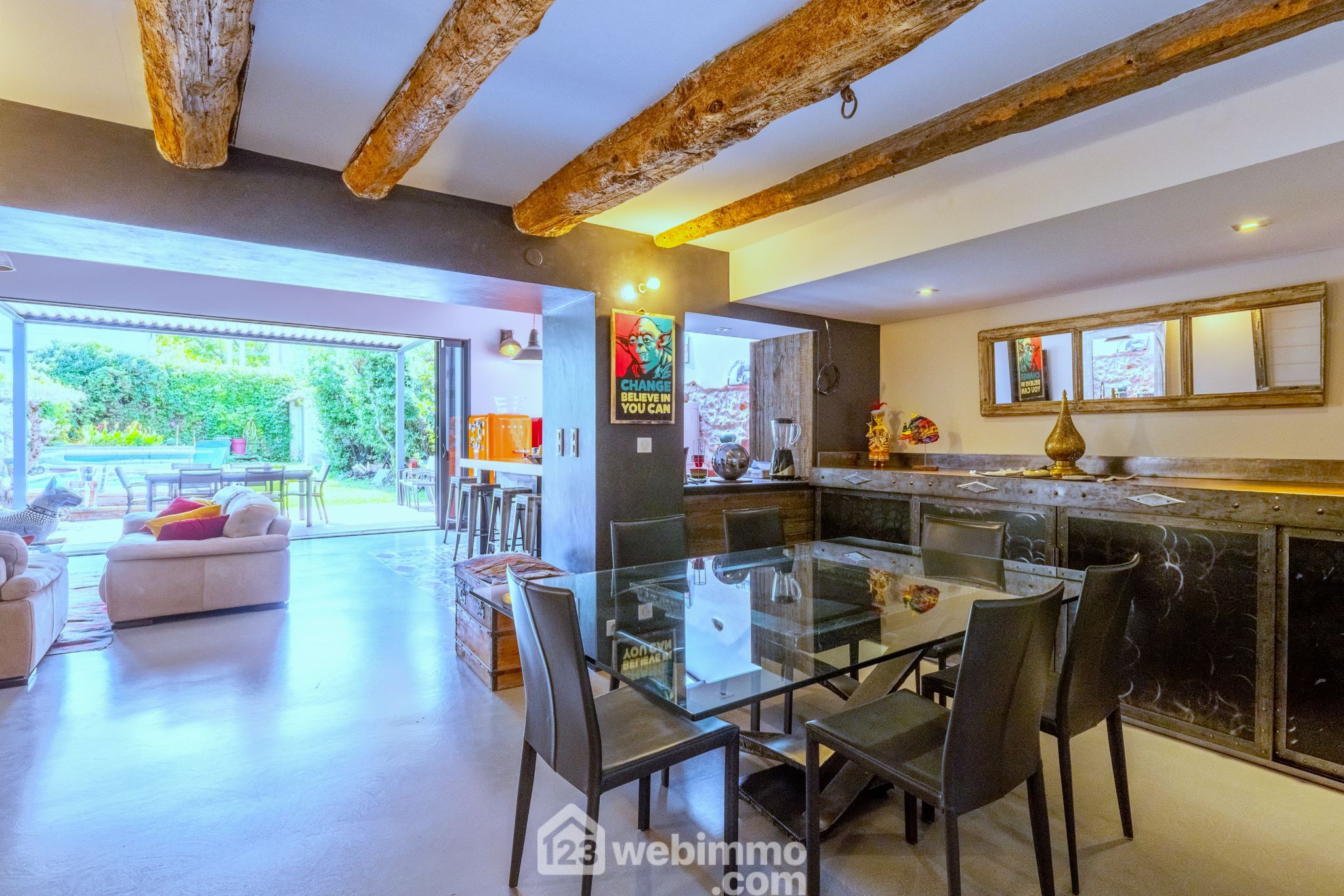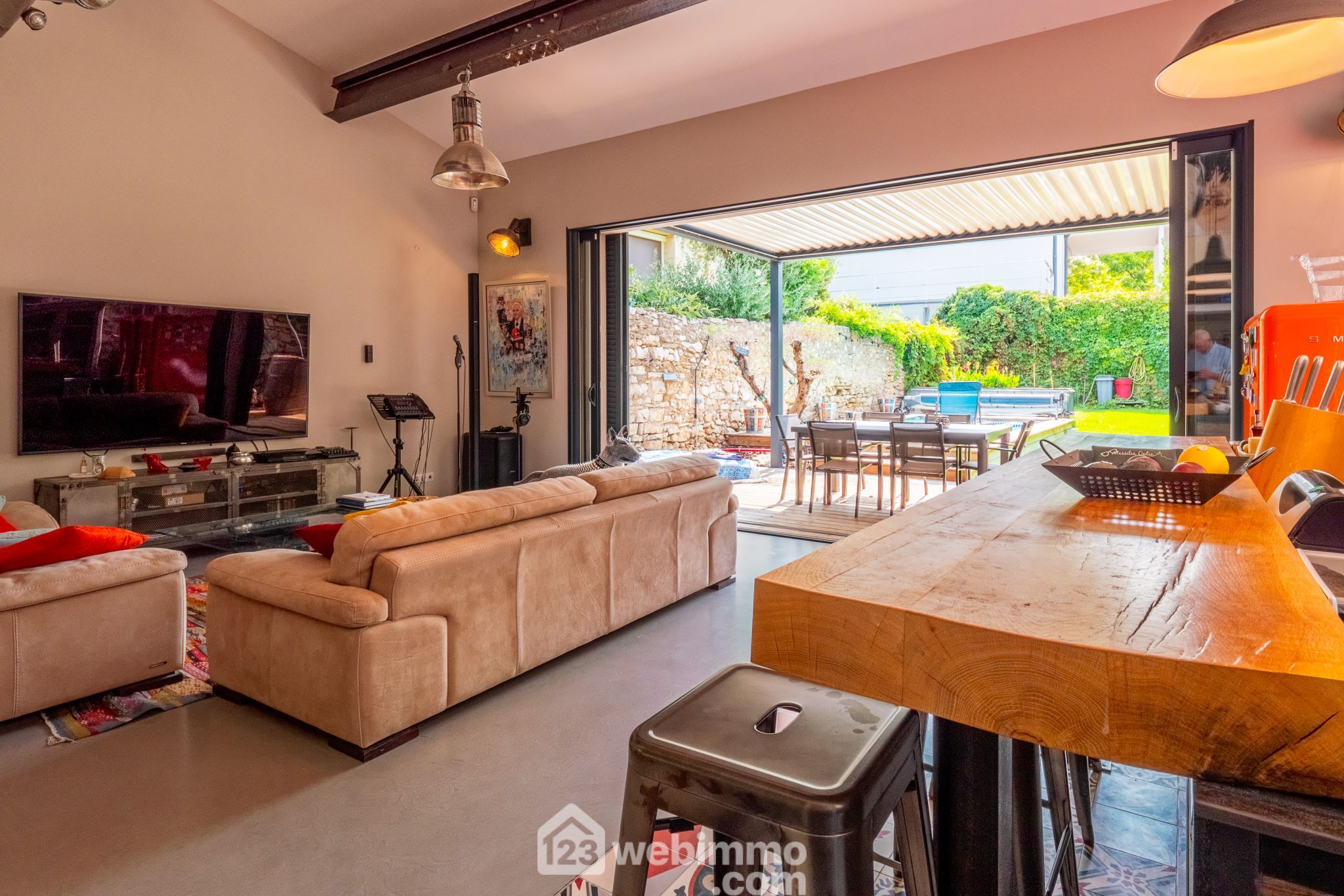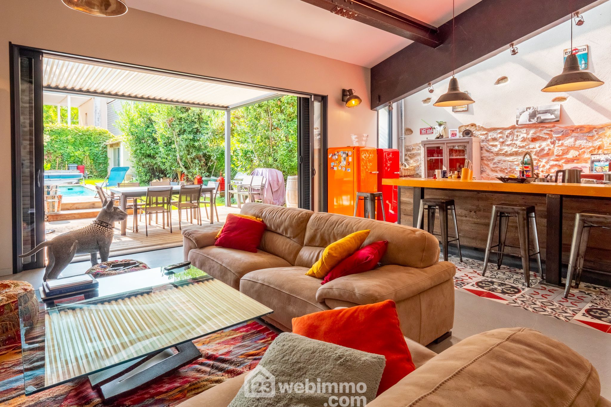Un vaste séjour/cuisine au volume optimisé en cathédrale ouvre largement (5 mètres à galandage) sur un joli jardin avec piscine sans vis-à-vis, et pergola bioclimatique de 20 m².