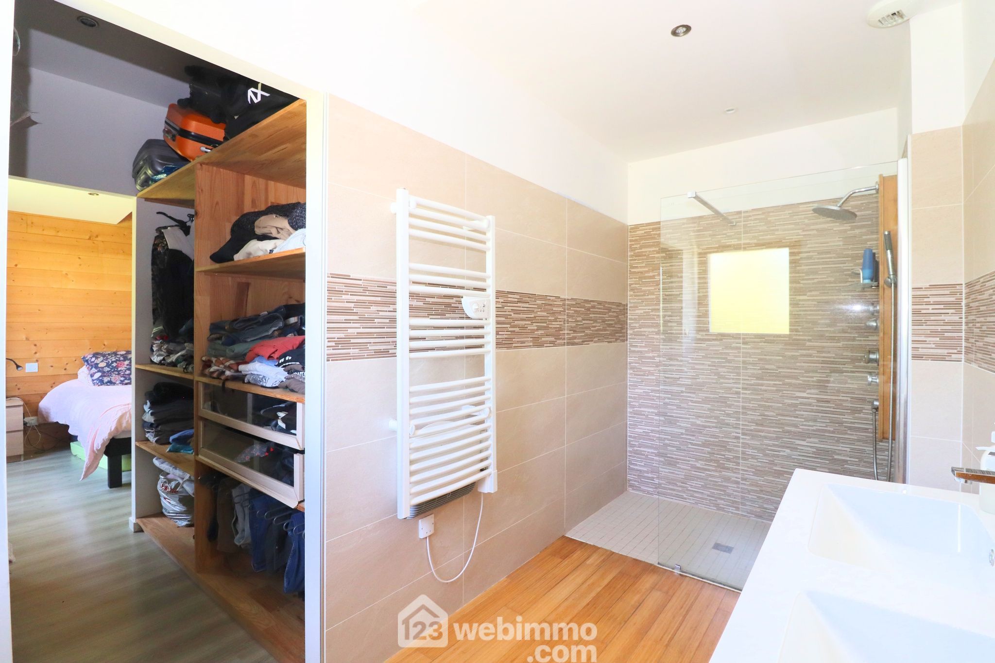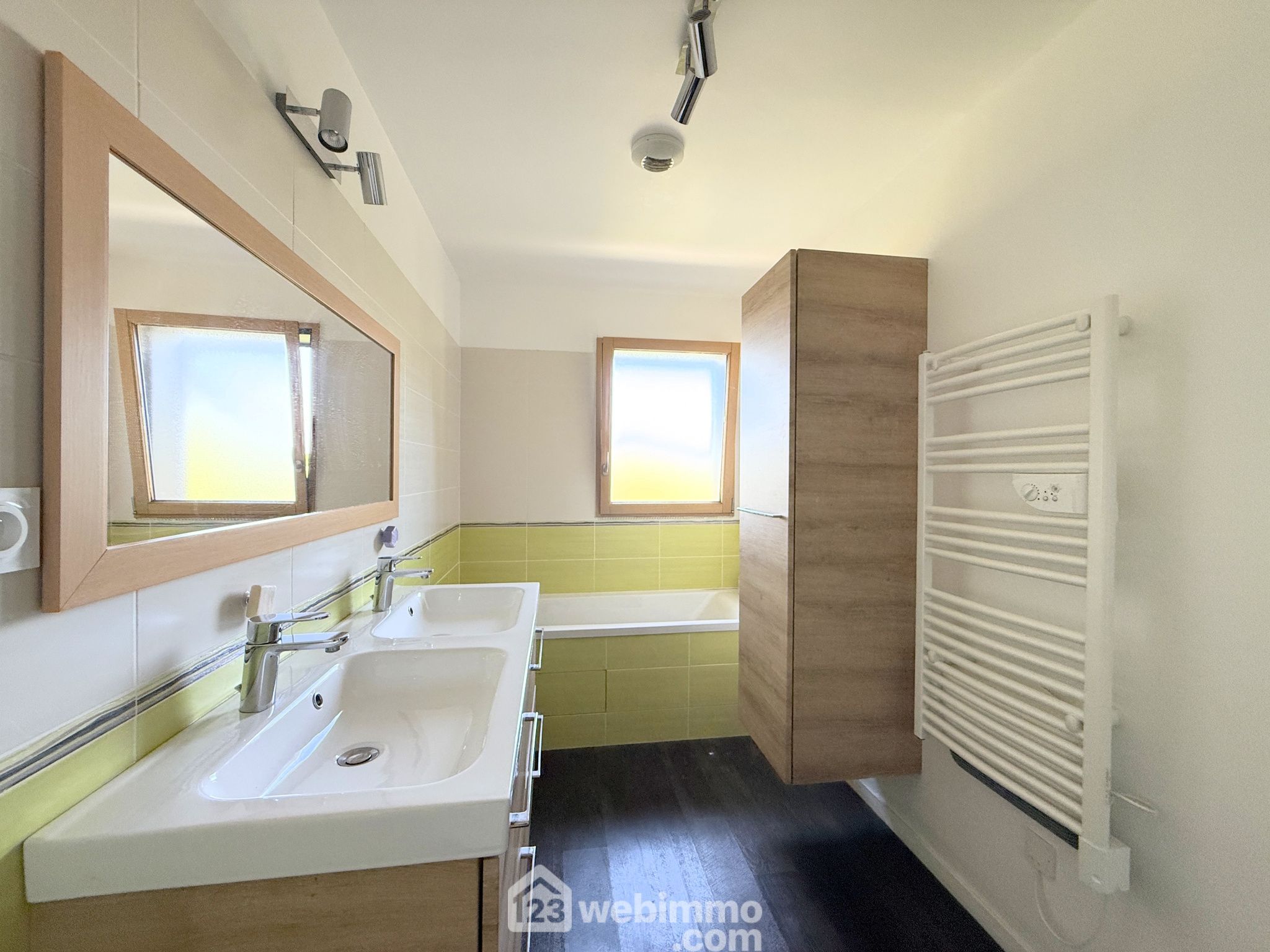 À l’étage : trois chambres supplémentaires, une salle de bains familiale avec double vasque, et un second WC.