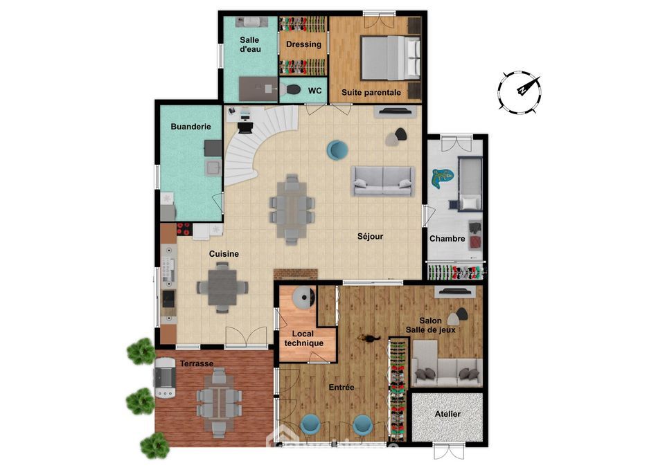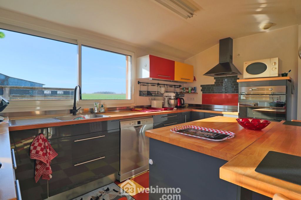 Maison avec vie de plain-pied, 161 m2 habitables, 6 pièces, 4 chambres, terrain de 2400 m2 arboré. Visite virtuelle 360°.