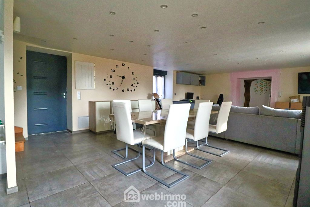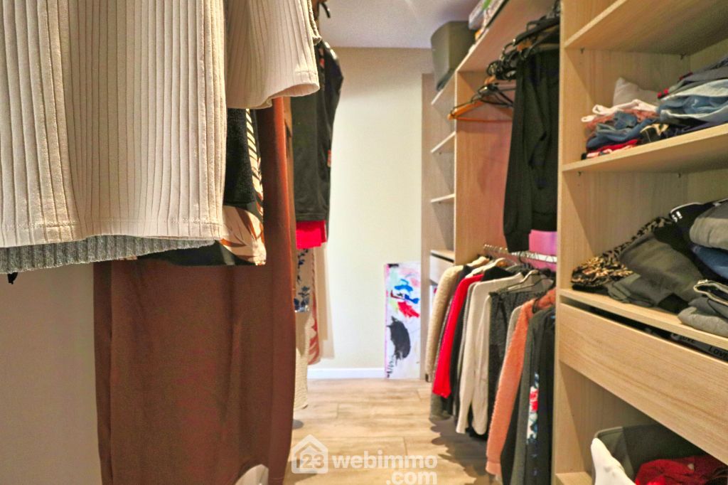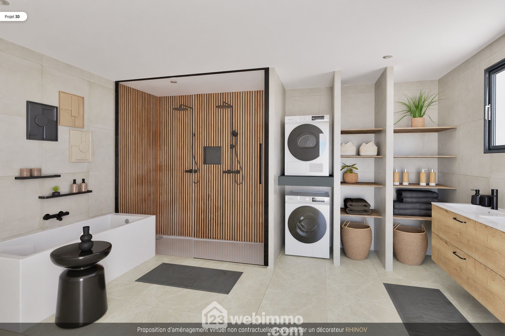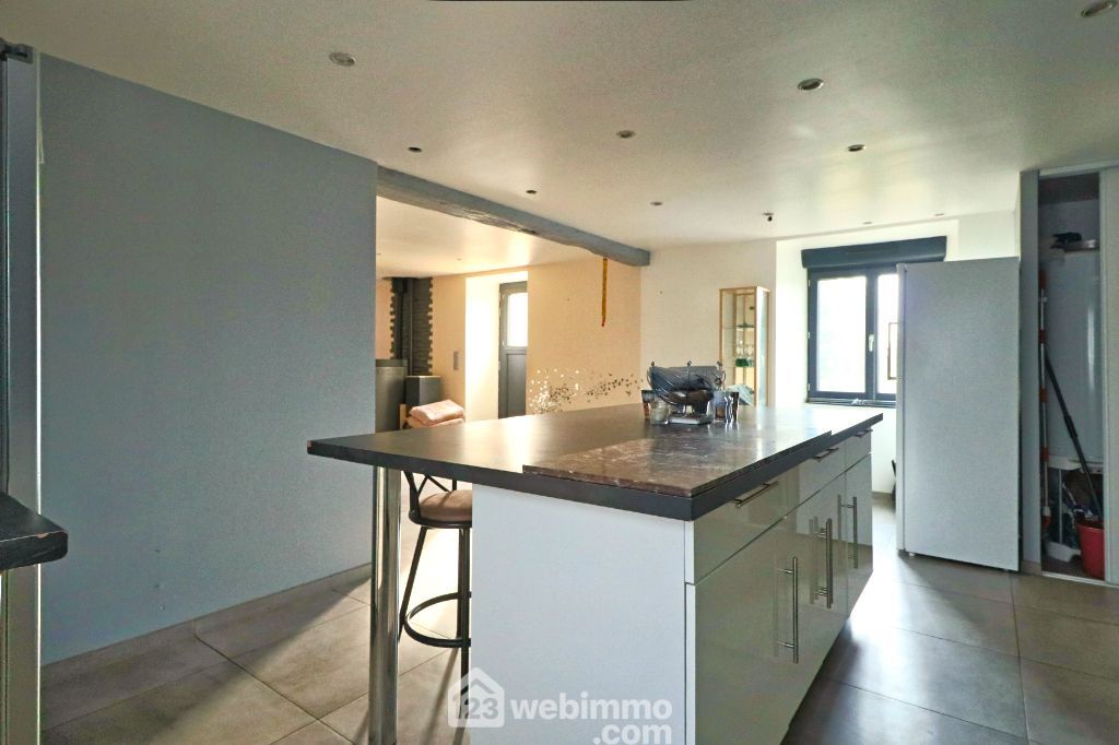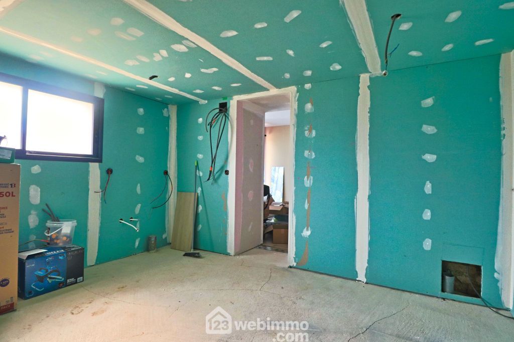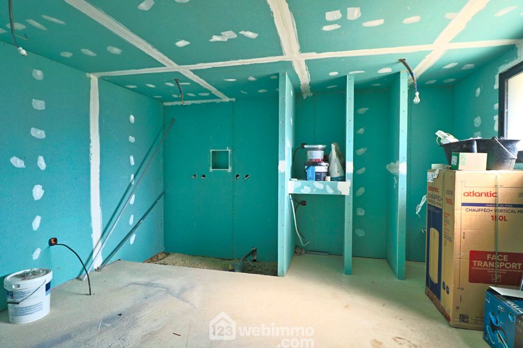 - Au rez-de-chaussée : séjour de 44 m2 avec poêle à granulés qui chauffe la maison, cuisine type US aménagée et équipée avec îlot central (four, plaque à induction, hotte, micro-onde), couloir avec WC indépendant et suite parentale de 33 m2 avec chambre (14 m2), dressing (4,5 m2), salle de bains (14,8 m2) à terminer (eau et électricité ok) et accès direct à la terrasse.