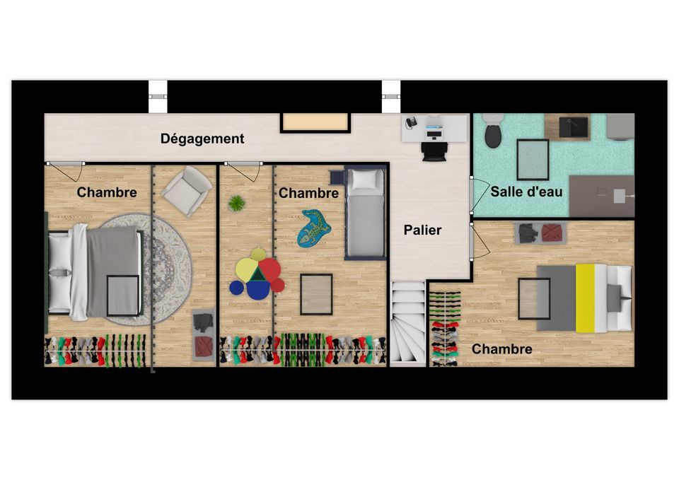 - A l'étage : dégagement, 3 chambres de 11 à 16 m2 et une salle d'eau avec douche italienne, simple vasque et WC.