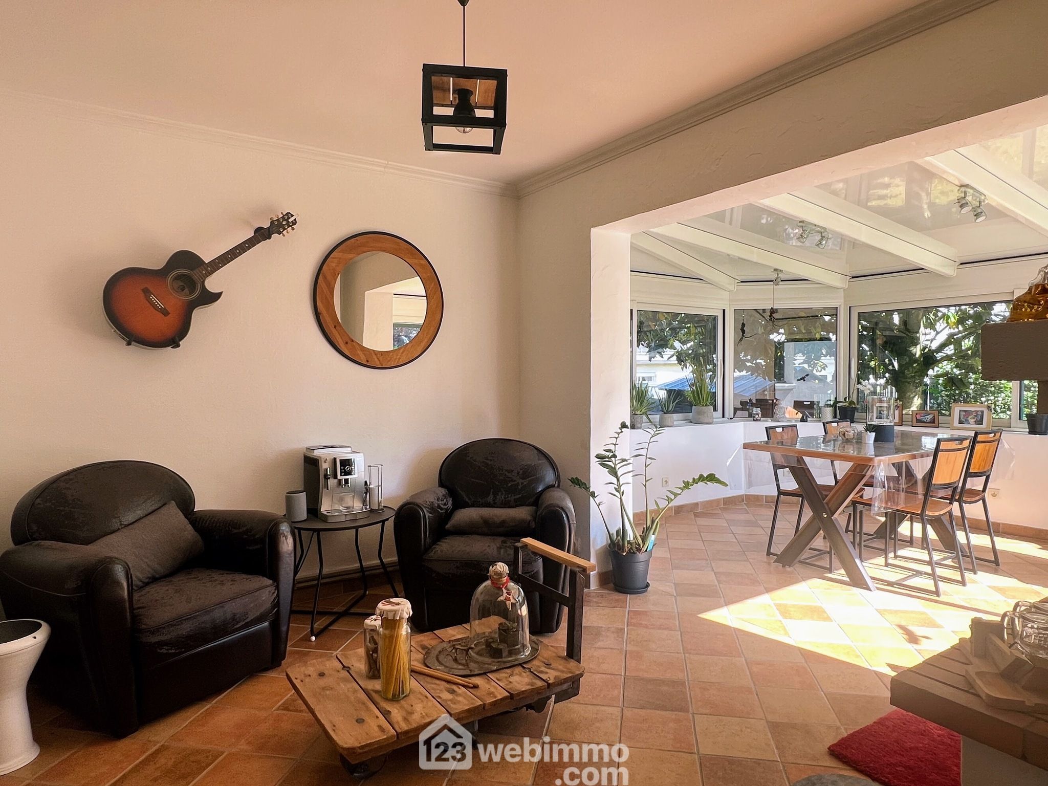 Côté pièces de vie, la maison dispose d’un double salon chaleureux, agrémenté de cheminées, et d’un séjour lumineux installé dans une véranda bien exposée, offrant un cadre agréable pour les repas ou les moments en famille. La cuisine, moderne et entièrement équipée, intègre un coin repas convivial et fonctionnel.