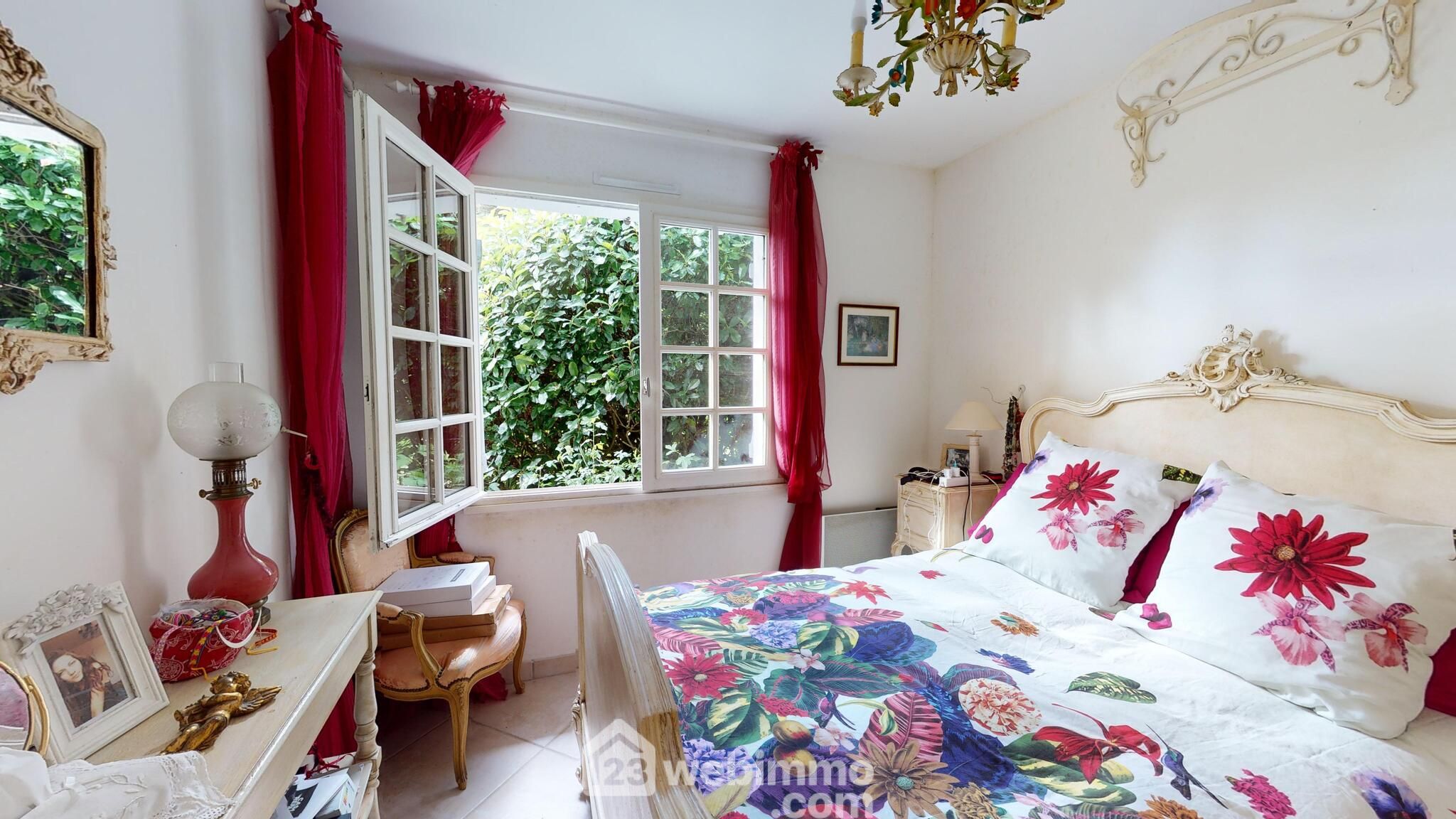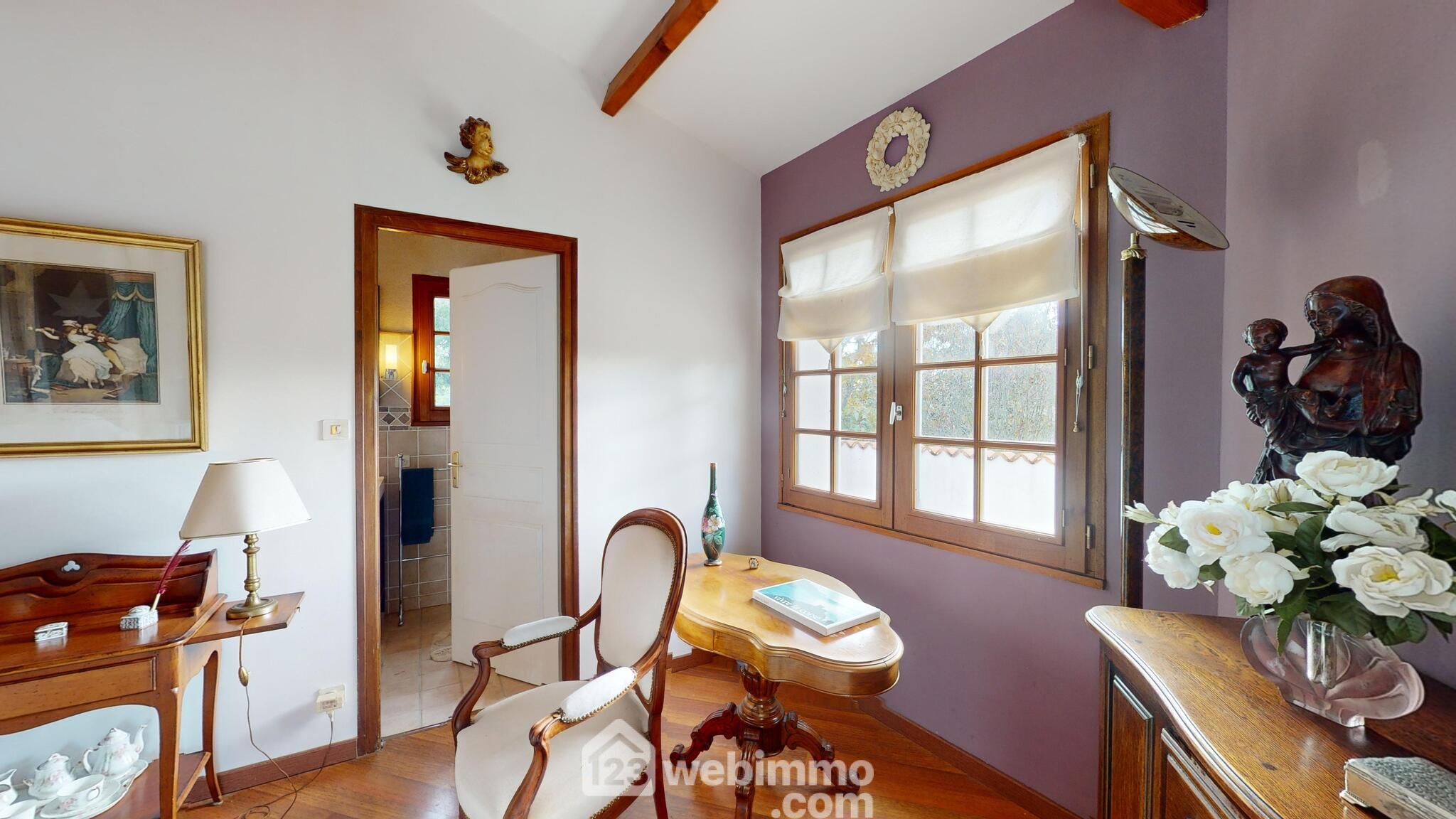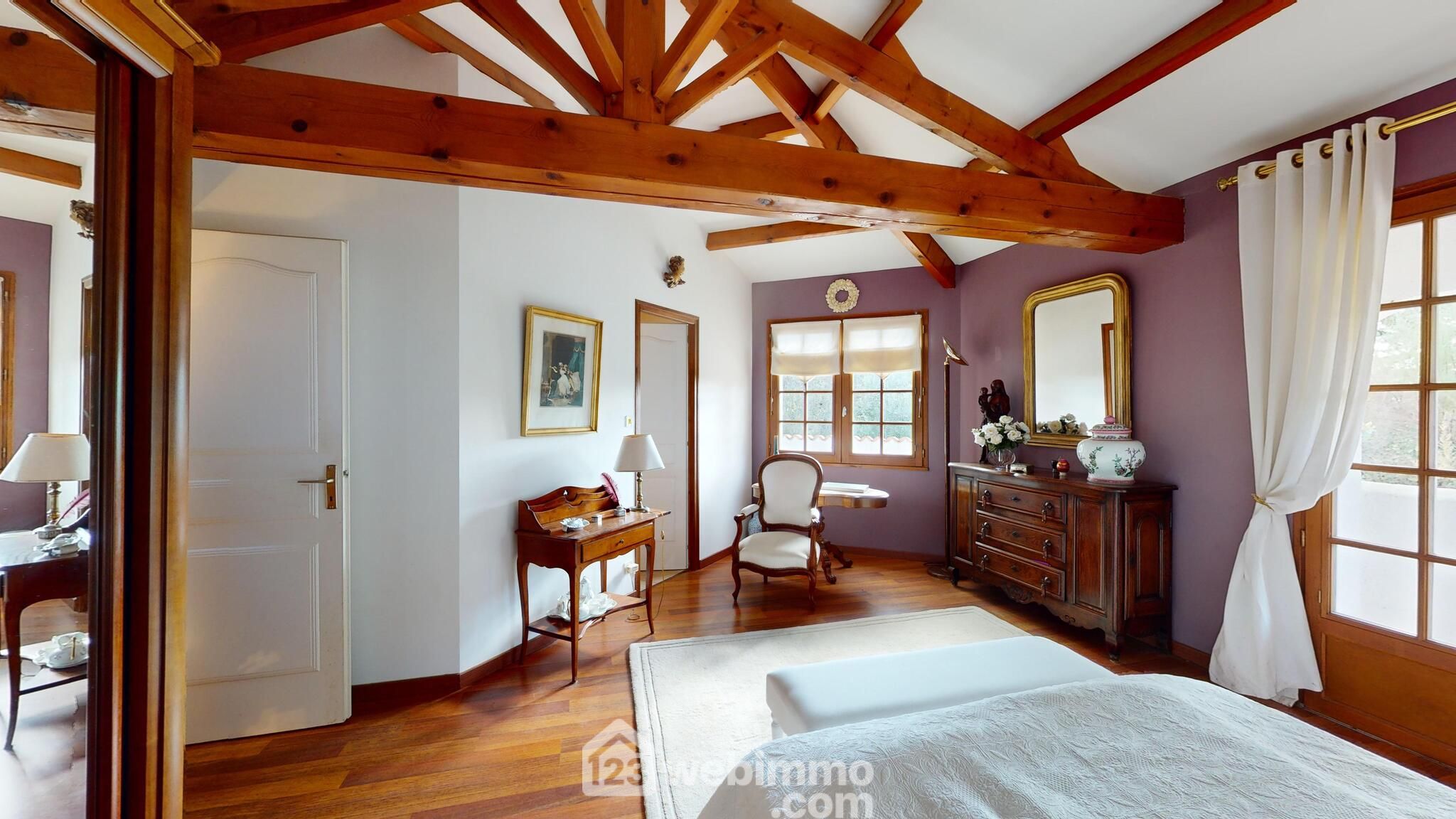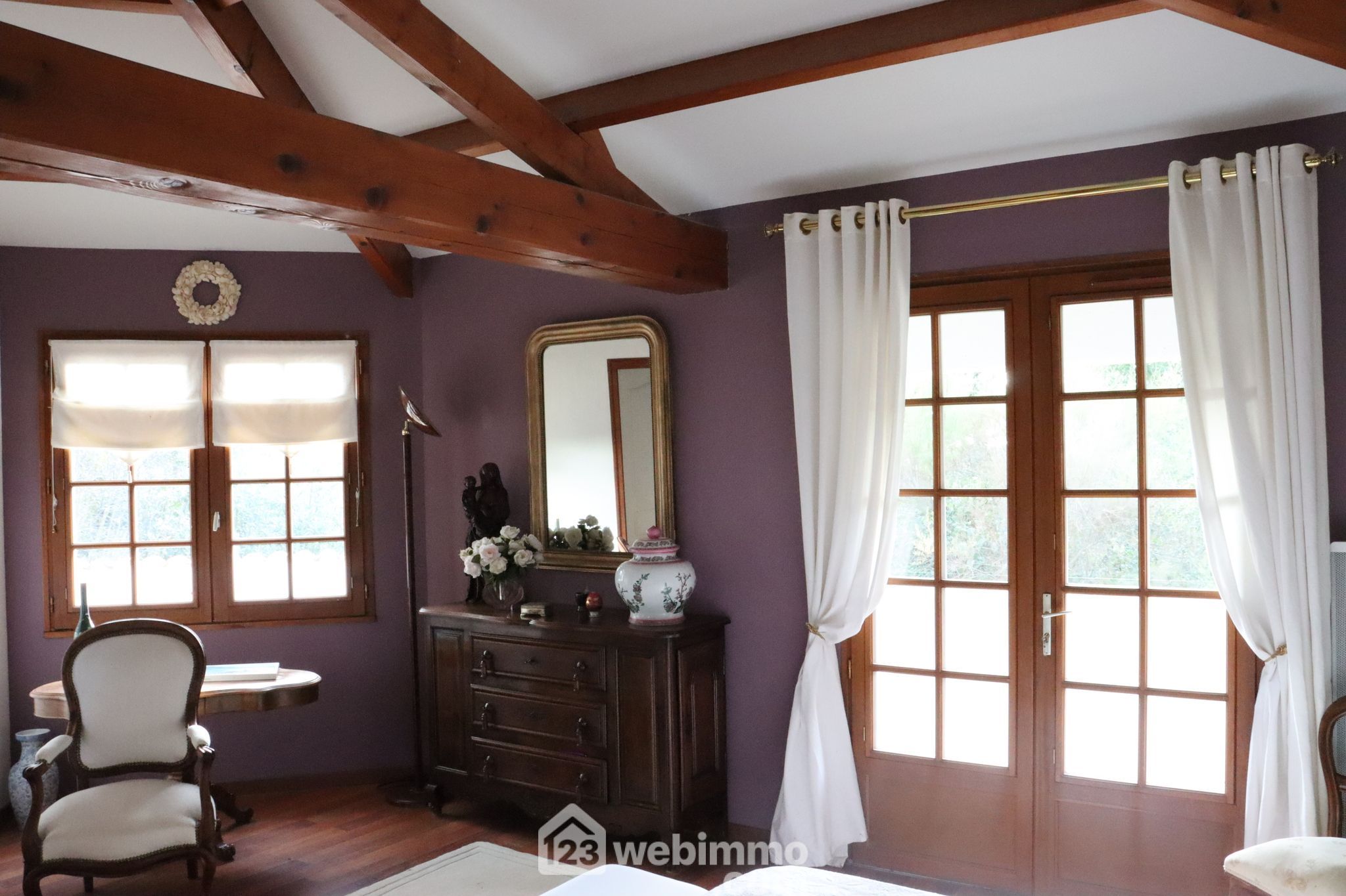 À l’étage, la suite parentale est un véritable cocon de sérénité, complétée par un balcon privé d'où s'ouvre une vue imprenable sur le parc.