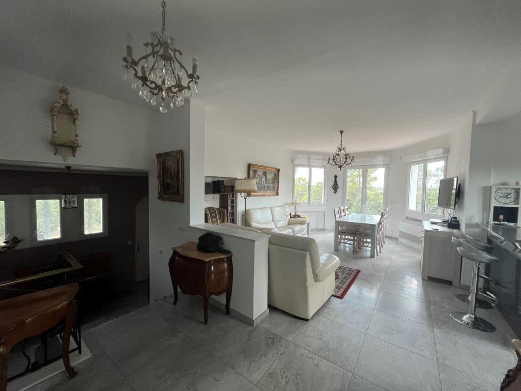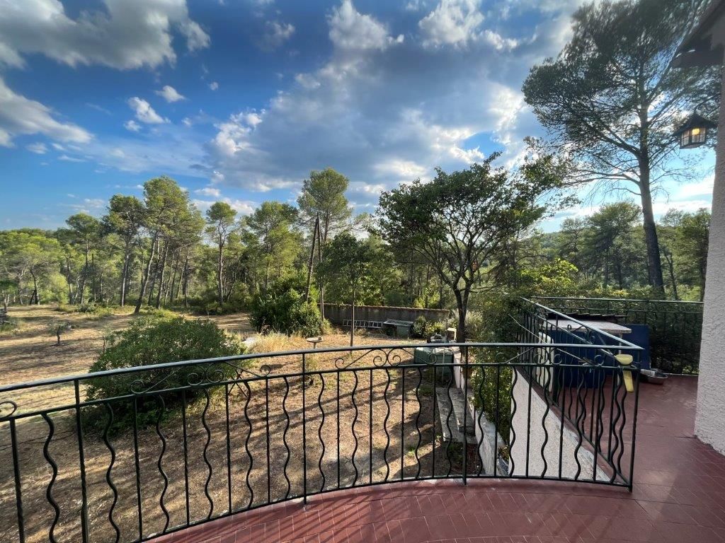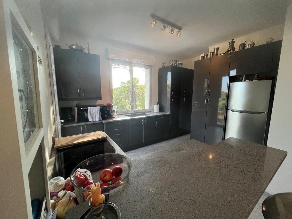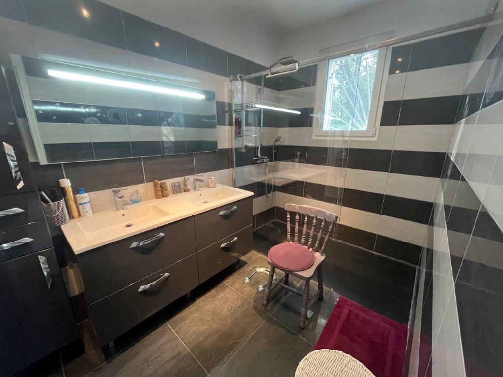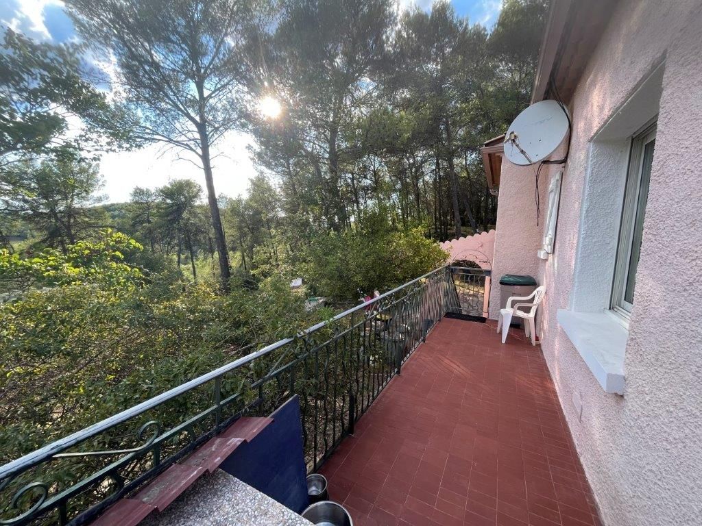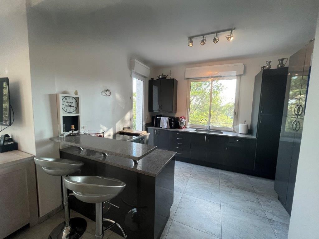A l'étage 2 chambres, une grande salle d'eau, un coin WC séparé avec lave main, une belle cuisine récente ouverte sur le séjour, une grande terrasse accessible de la cuisine et du séjour avec une vue panoramique sur le parc boisé.