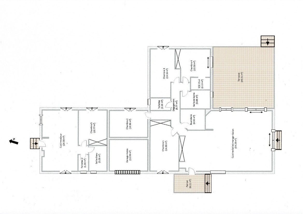 Elle est actuellement organisée en un T5 de 131 m2 et un T2 de 42 m2 indépendant (voir le plan).