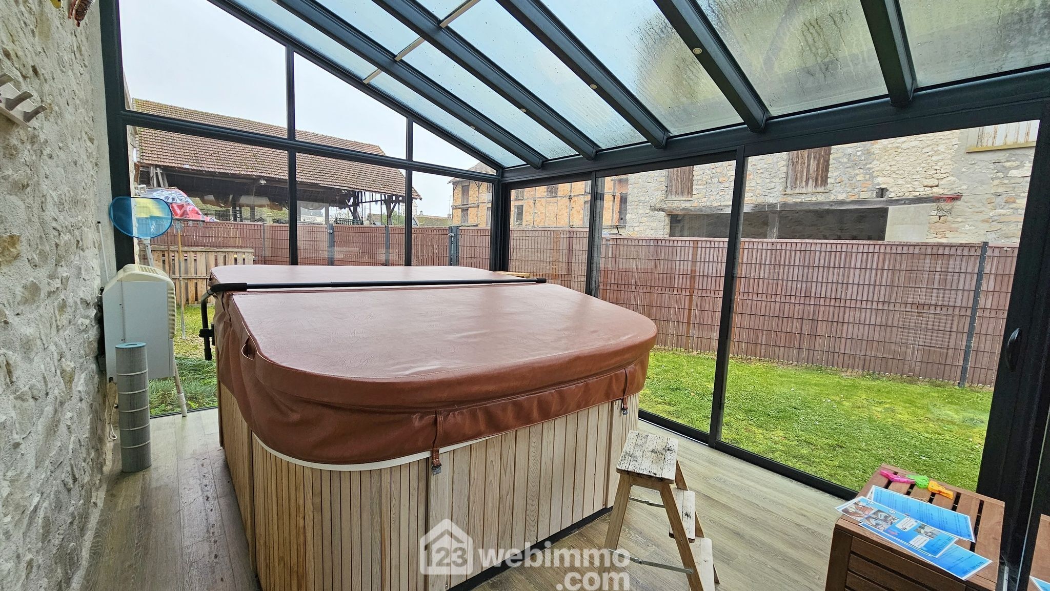 À l’extérieur, place à la détente : une véranda de 12 m² abrite un SPA, pour des moments de bien-être en toute saison. Le préau attenant et la terrasse invitent à profiter du jardin clos de 1554 m², véritable havre de paix à l’abri des regards.