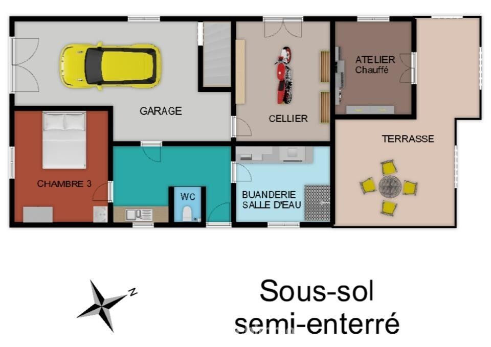 Au sous-sol semi-enterré : garage, cellier, pièce avec WC, salle d'eau/buanderie et chambre avec point d'eau.