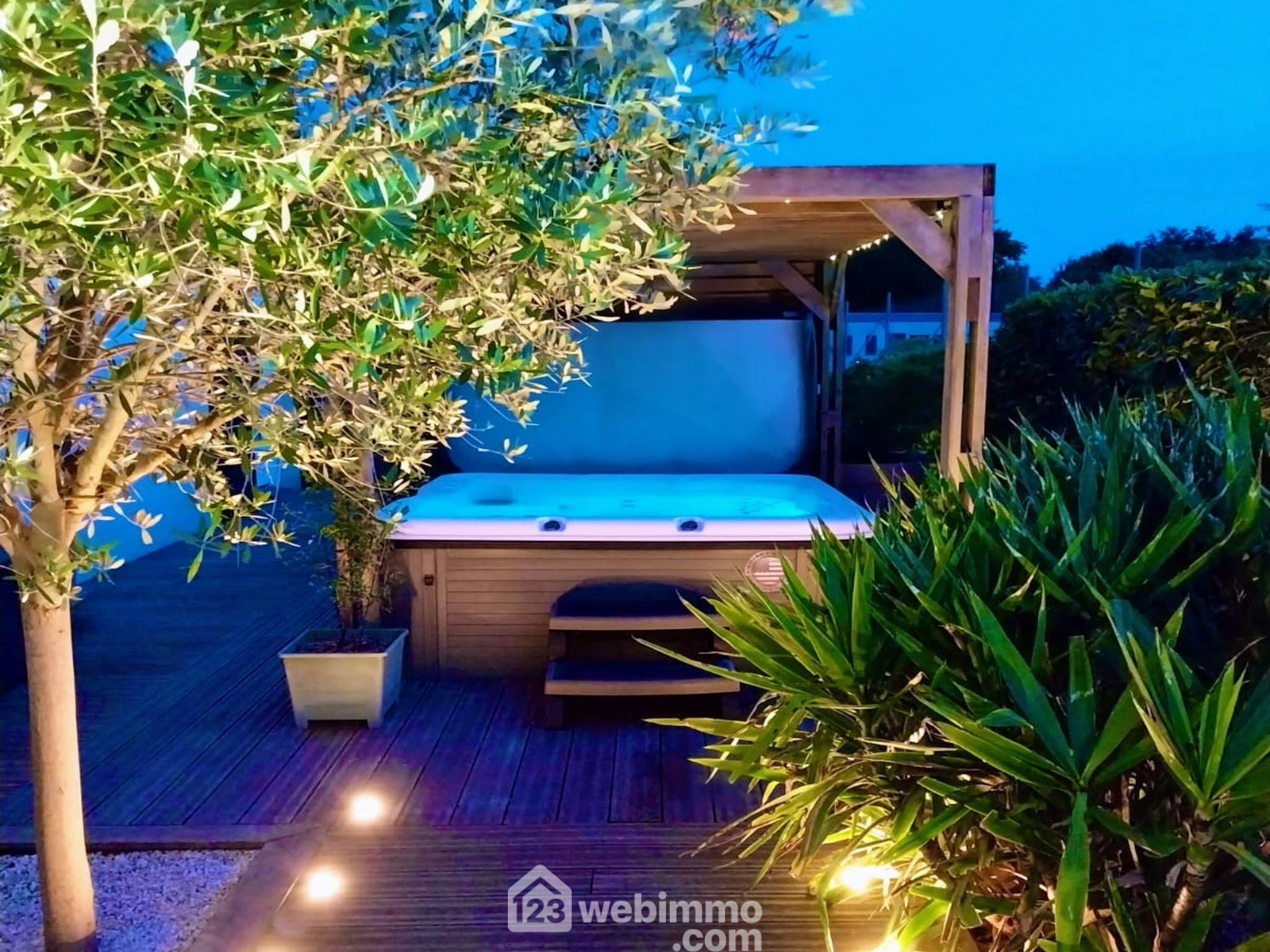 Côté extérieur, la parcelle de 883 m², soigneusement aménagée, propose deux terrasses dont une en bois avec un spa 6 places offrant un véritable espace de détente.