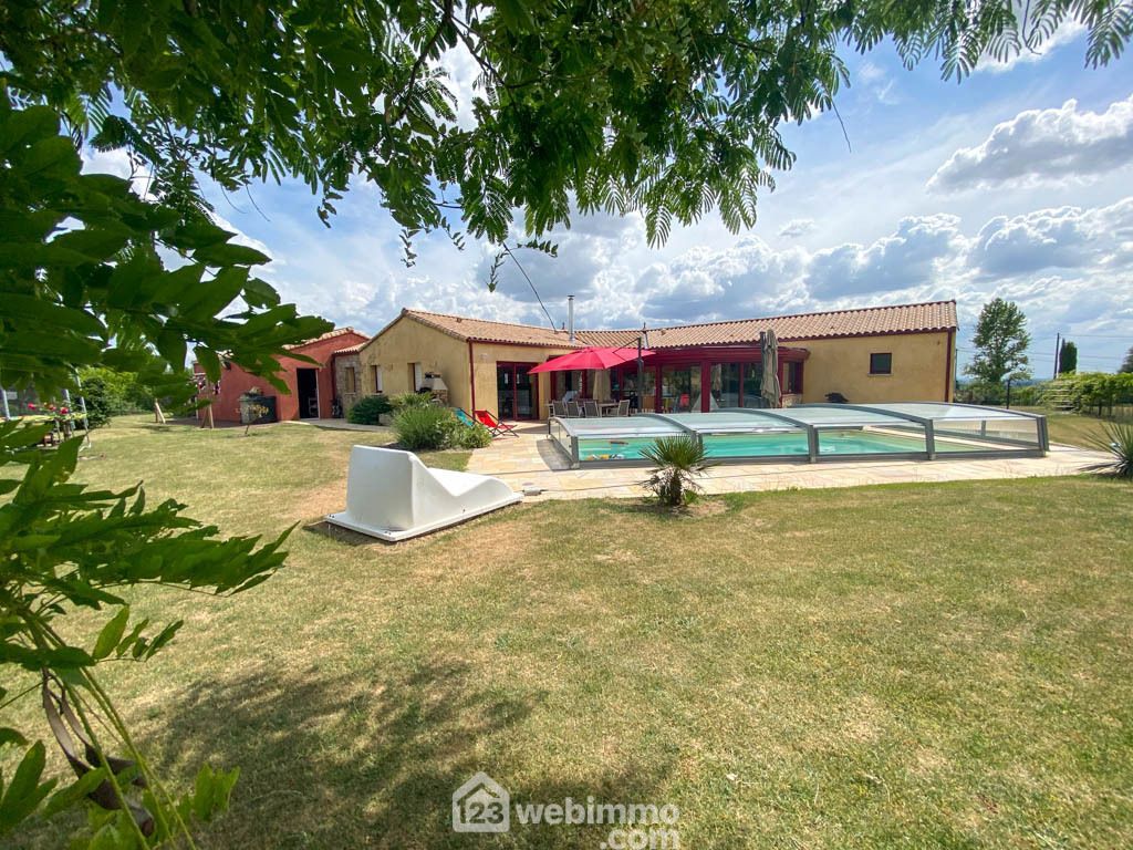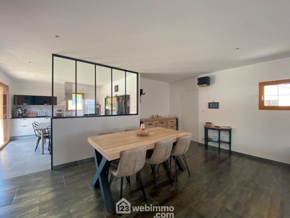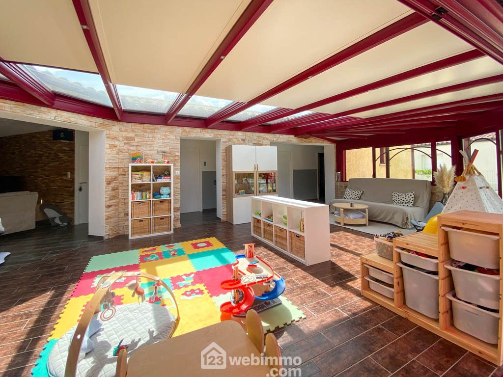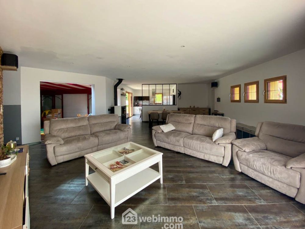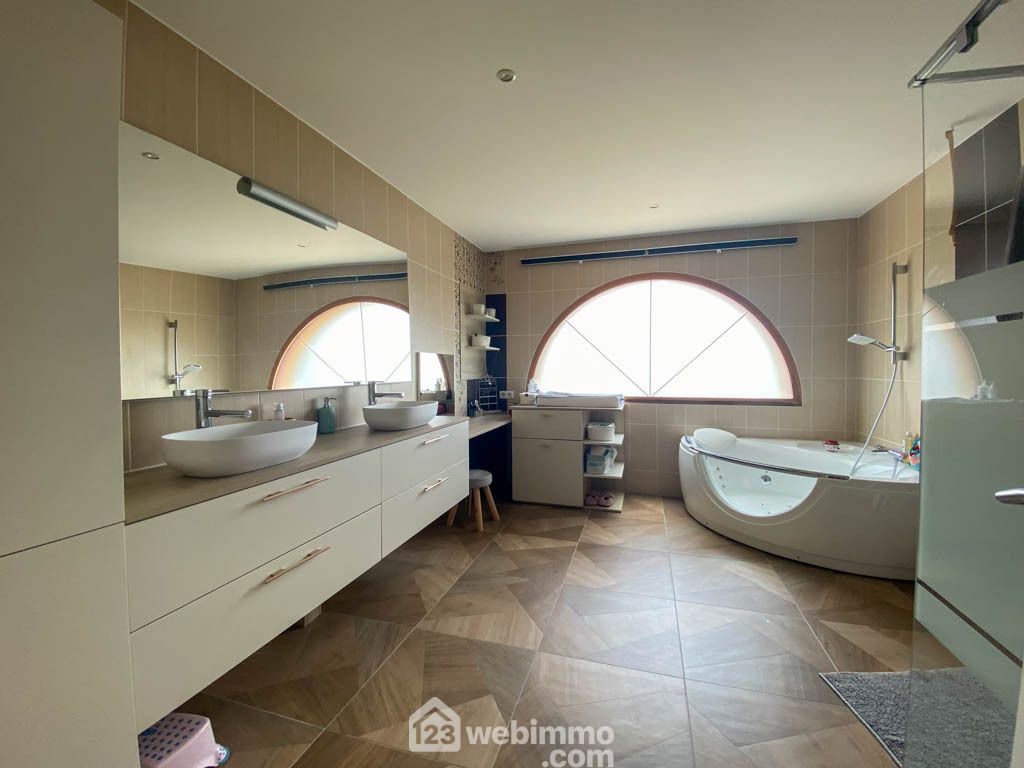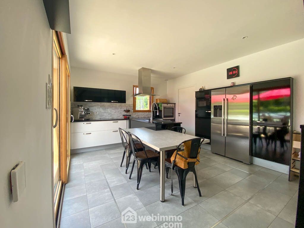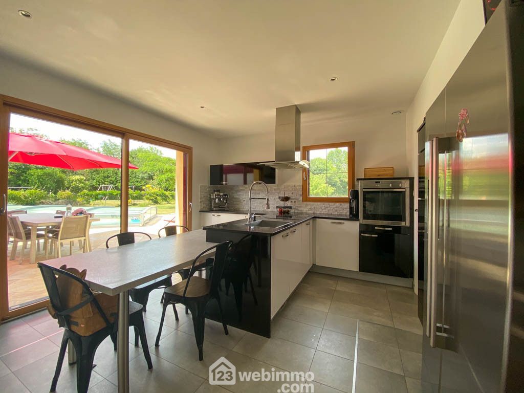 Elle se compose : d'un hall d'entrée avec placard, d'un spacieux et lumineux séjour/salon de 46 m² avec poêle mixte (granulés et bois installé en 2022) pour une ambiance cosy , une cuisine moderne avec verrière de 16 m² environ aménagée et équipée, une véranda de 37 m² baignée par la lumière naturelle donnant sur la terrasse et sa piscine. Coté nuit : 3 chambres de 14 m² environ avec placards intégrés / dressing, une salle de bain entièrement rénovée en 2022 de 16 m² avec baignoire et douche à l'italienne, 2 WC avec lave-mains. Une buanderie, deux garages de 60 m² (voitures et camping-car). L'intérieur offre tout le confort moderne : volets automatiques, portail automatique avec vidéophone, alarme, portes de garage motorisées, aspiration centralisée, chauffage au sol par géothermie (2 puits/ forage). Aménagements extérieurs, barbecue, piscine de 8 x 4 chauffée (géothermie) et sécurisée (dôme installé en 2022). De très belles prestations, n’hésitez plus et venez visiter !