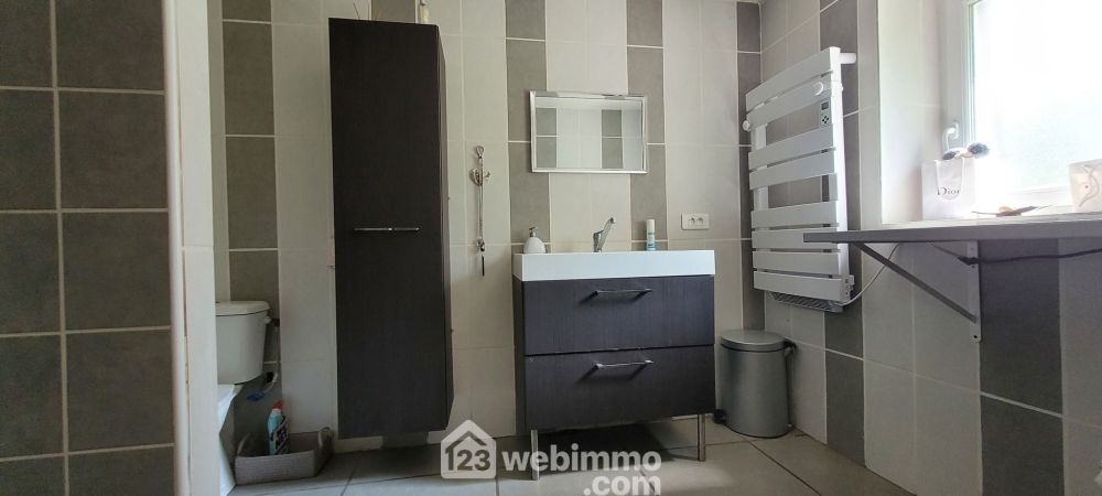 - En rez de chaussée d'une entrée avec placards, une cuisine aménagée ouverte sur un salon-séjour de 49m² avec accès sur la terrasse, une salle d'eau avec WC.