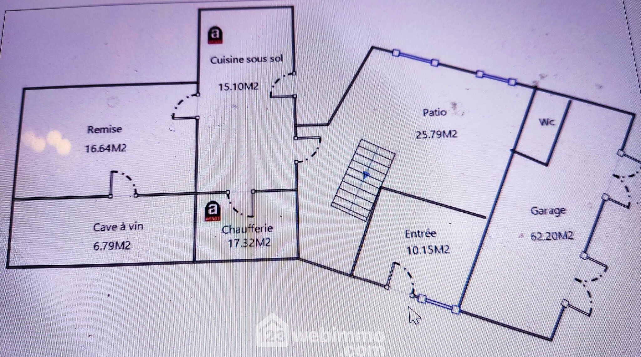 En rez-de-jardin : pièce salon, buanderie, chaufferie, cave à vin et garage avec sanitaire.