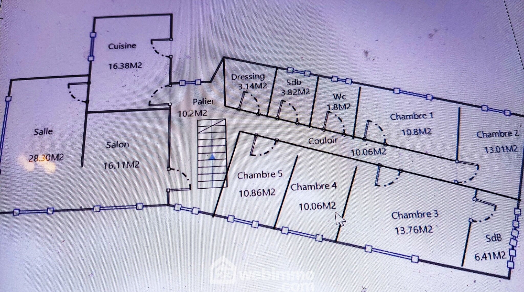 Elle comprend : vaste entrée, pièce à vivre avec cheminée et baies vitrées accès terrasse, dressing, une salle de douches, wc avec lave mains, bureau, 4 chambres (deux bénéficient d'un accès à une salle de douches, une d'un lavabo et trois s'ouvrent sur un large balcon.
