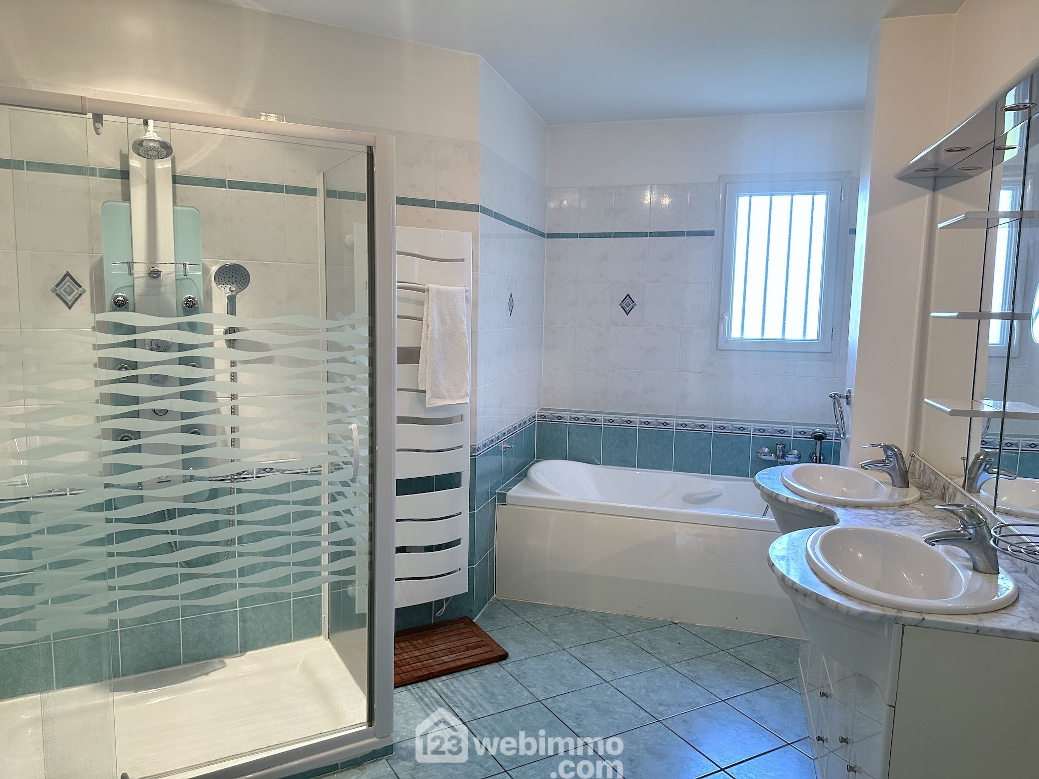 Un dégagement mène à une chambre de 19m² avec de grands placards intégrés, une salle de bains complète (avec douche et baignoire), ainsi que des WC séparés.