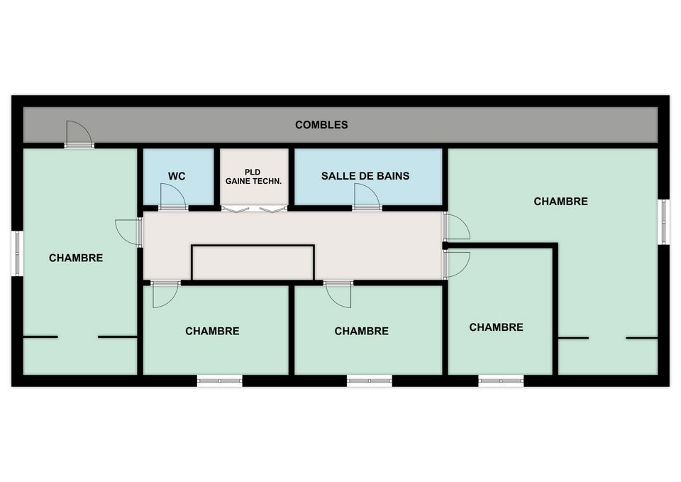 A l'étage : palier, 5 chambres, salle de bains, WC.