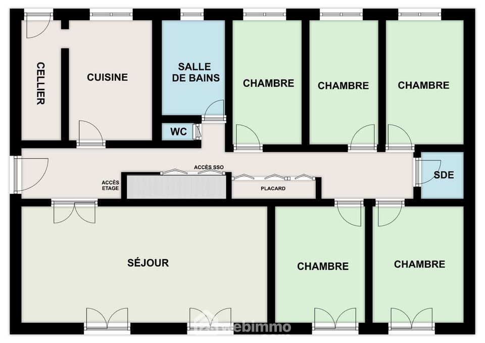 Au rez-de-chaussée : entrée, séjour, cuisine, cellier, 5 chambres (bureau, lingerie, dressing), 2 salles d'eau-bains, WC.