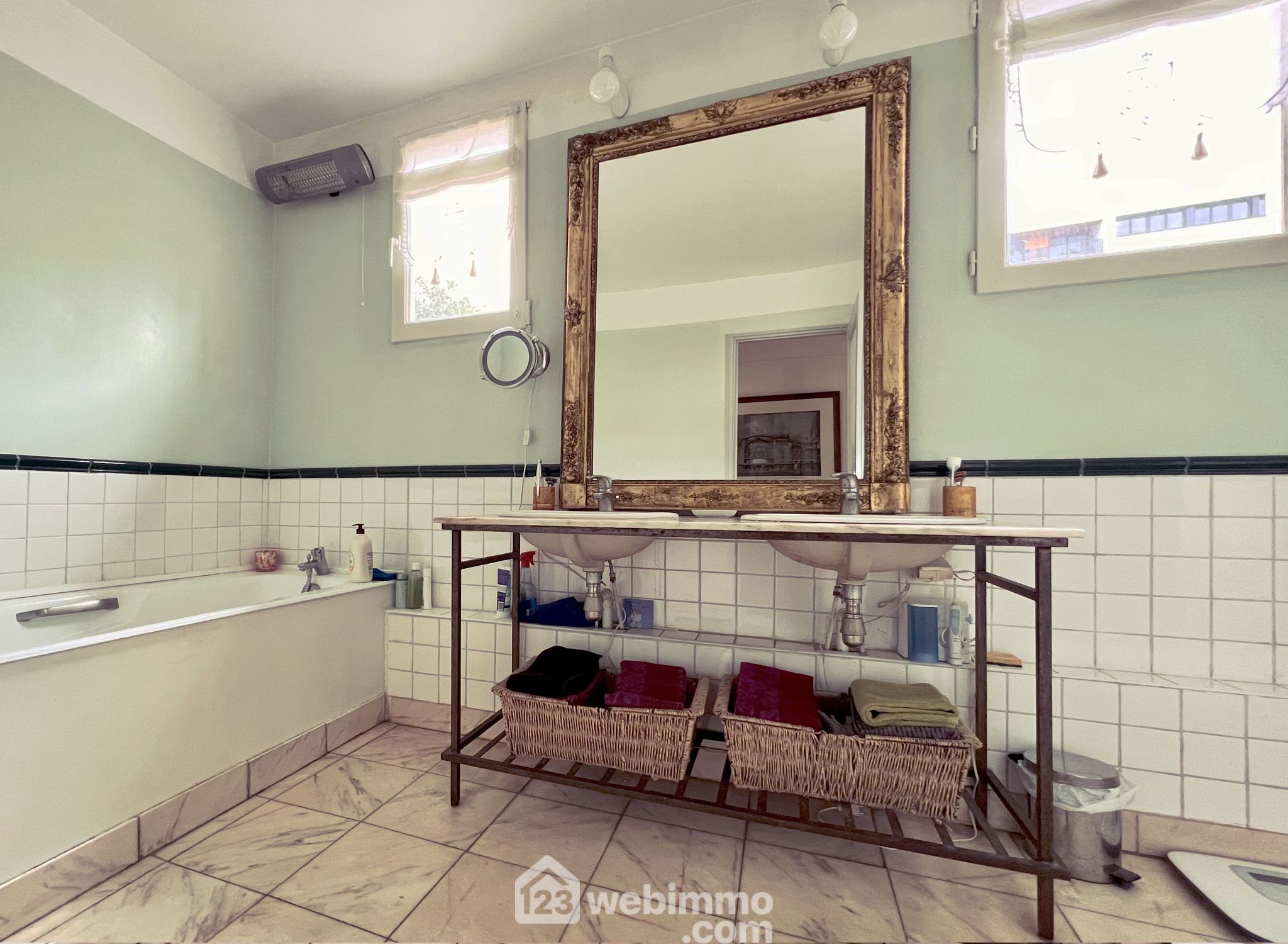 Le premier étage s'ouvre sur un grand dégagement desservant 4 belles chambres, une salle de bains avec double vasque, baignoire et douche ainsi que des wc séparés.