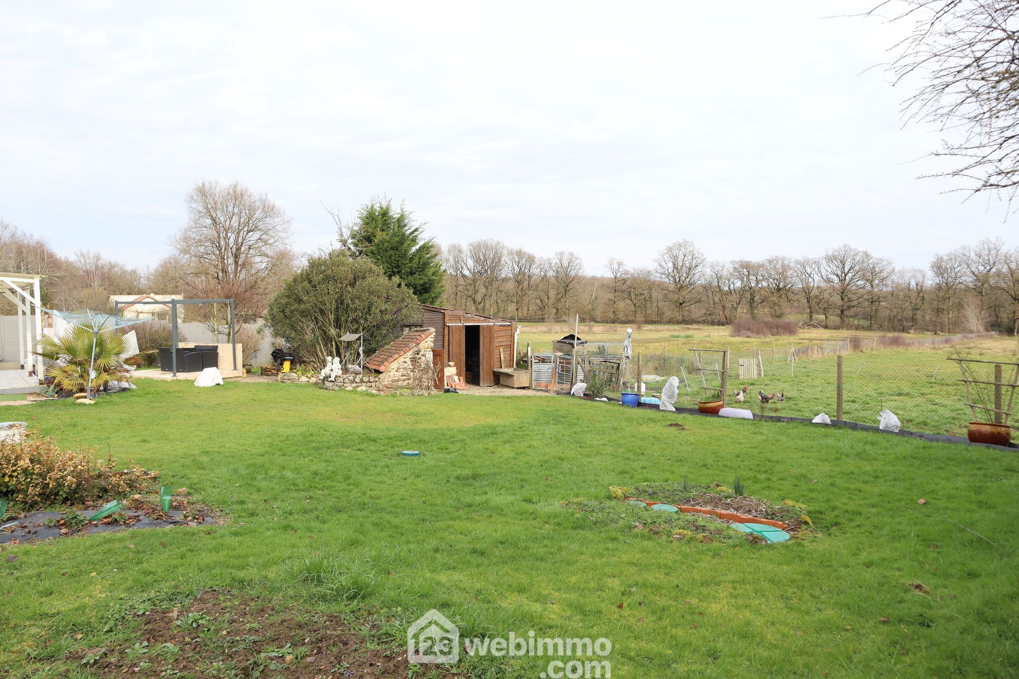 Terrain clos et arboré de 1180 m2 avec cour de stationnement à l'avant, 42 m2 de terrasses, potager, poulailler, puits et plusieurs dépendances de type toits et chalets.