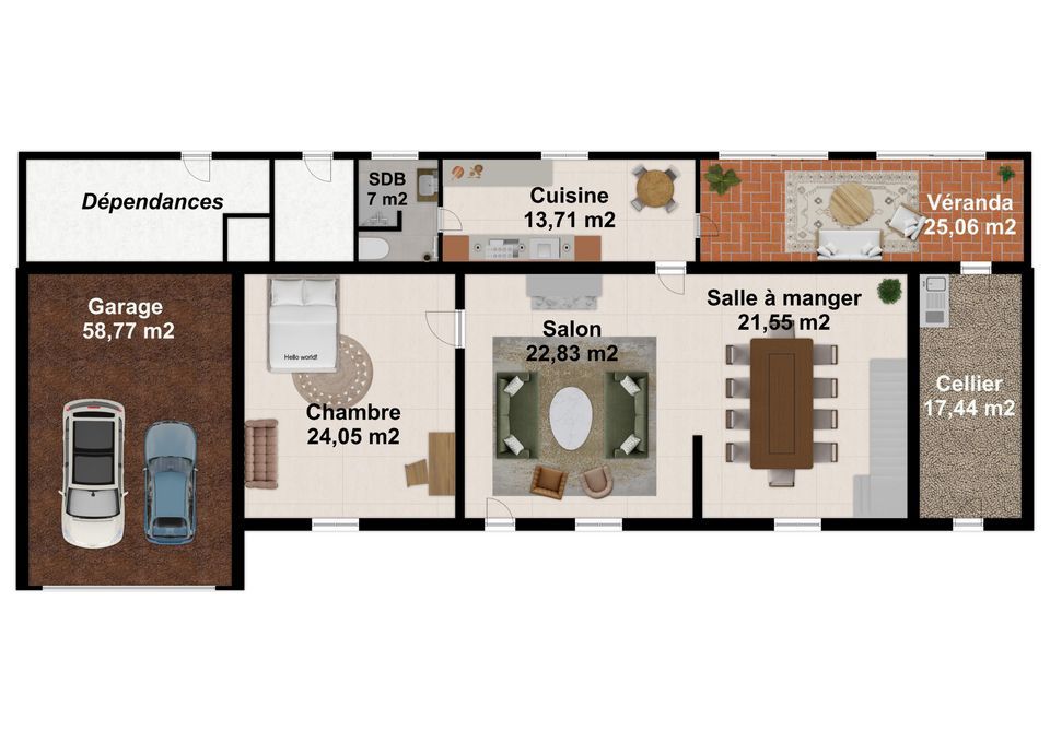 Au rez-de-chaussée : pièce de vie de 44 m2 avec cheminée insert, cuisine aménagée, chambre, salle d’eau / WC, véranda non chauffée et cellier.