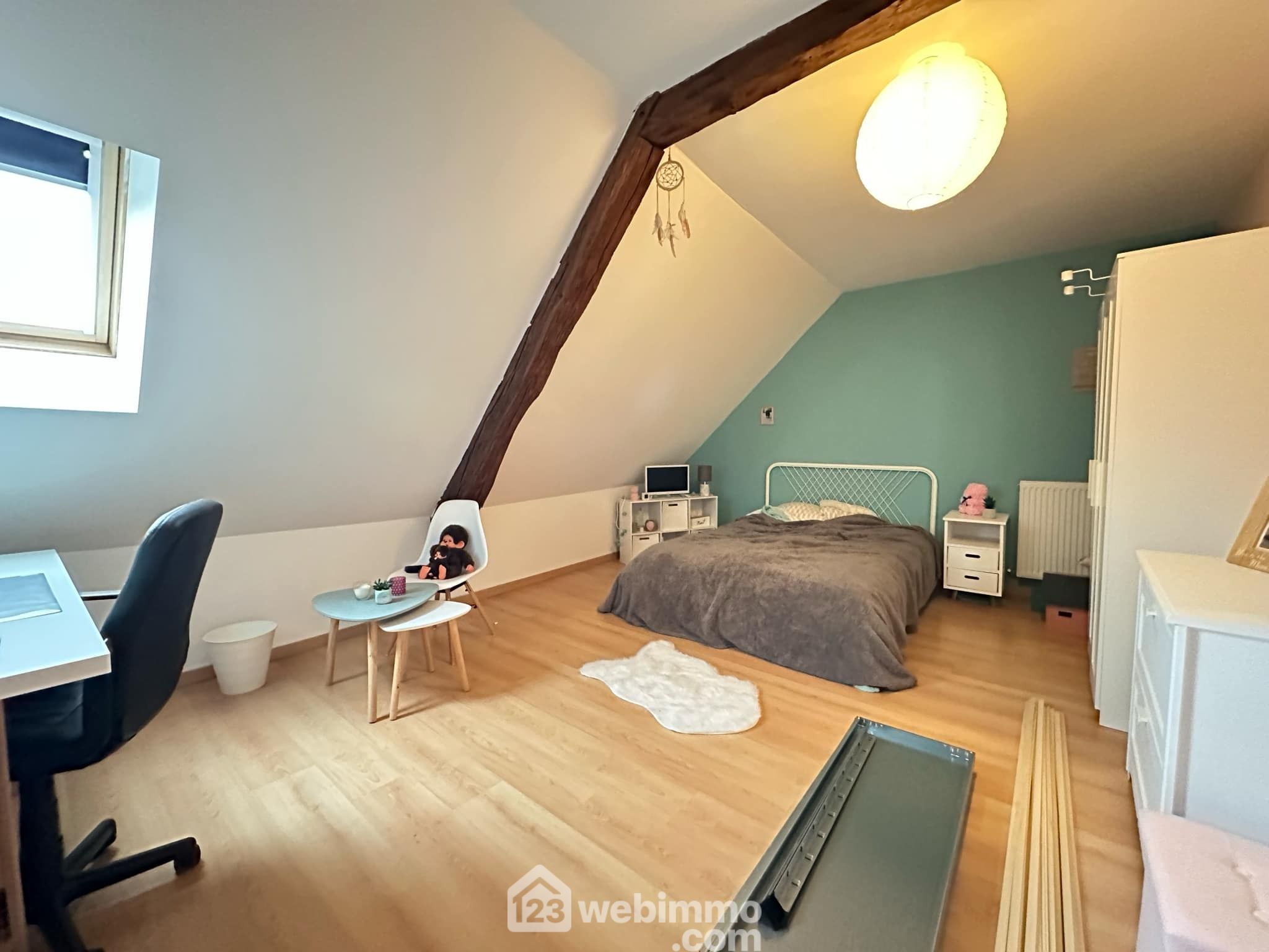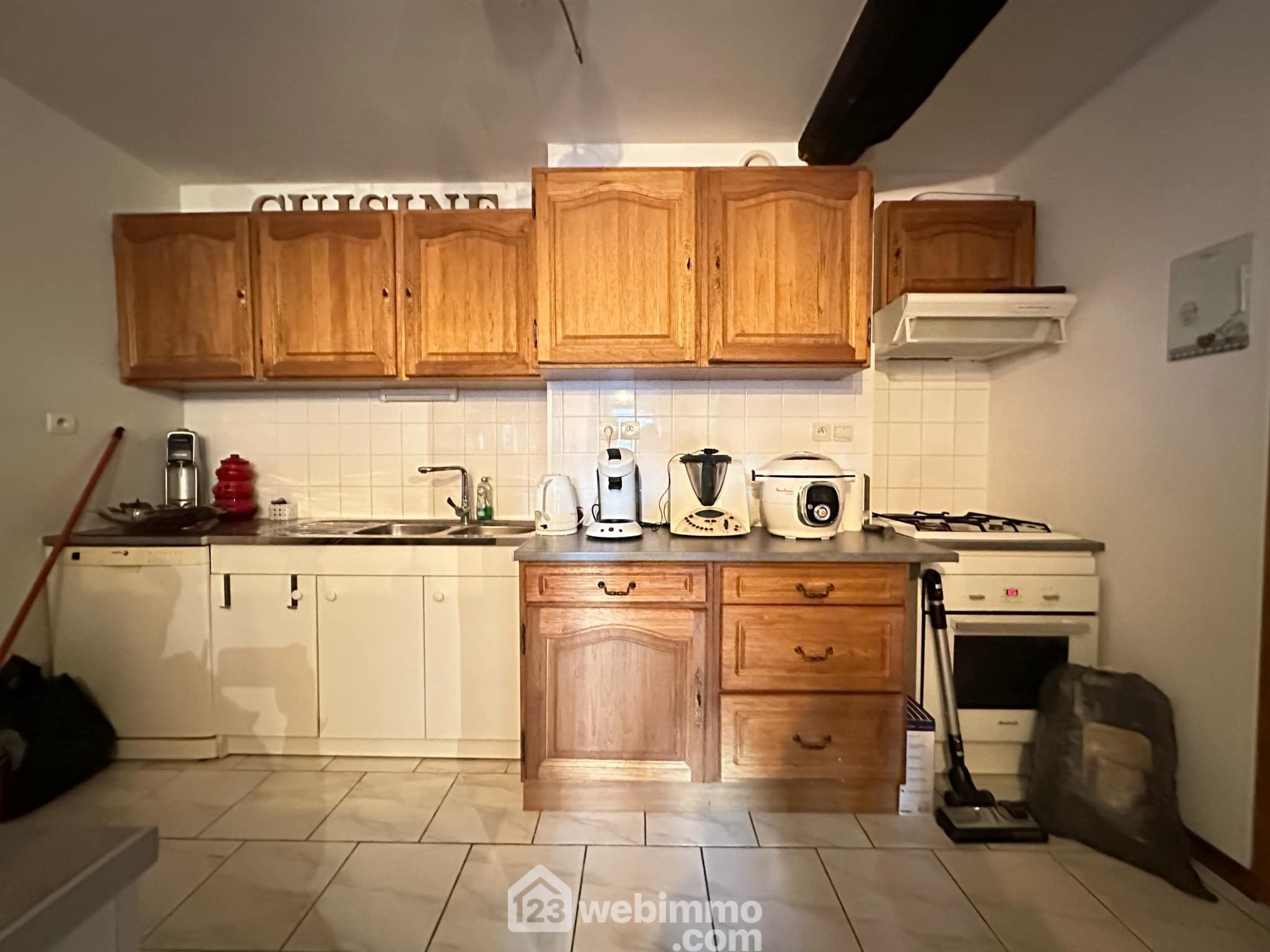 Maison n°2 (111 m² habitables), louée actuellement 475 €/mois, comprend un séjour ouvert sur la cuisine, trois chambres, salle de bains, WC et une cave.