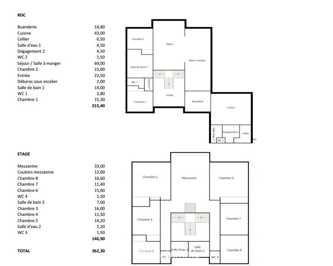 À l’étage, laissez-vous charmer par une superbe mezzanine de 45 m² (avec possibilité d'une chambre supplémentaire), 6 chambres, une salle d'eau, une salle de bain, et deux WC séparés.