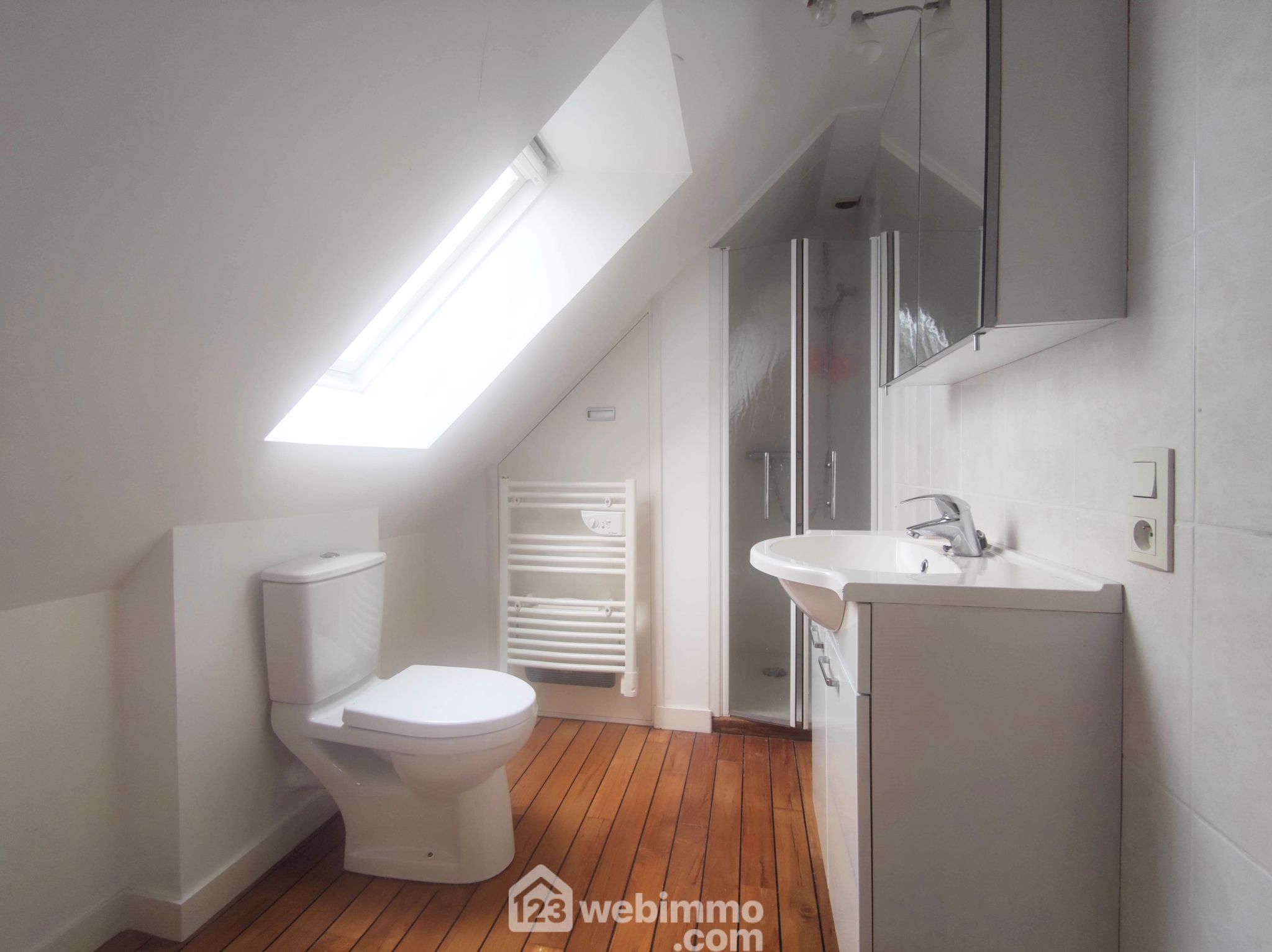A l'étage, un palier avec placard intégré de 5m2 dessert 2 chambres de 7 et 8m2, ainsi qu'une salle de douches avec WC de 4m2.