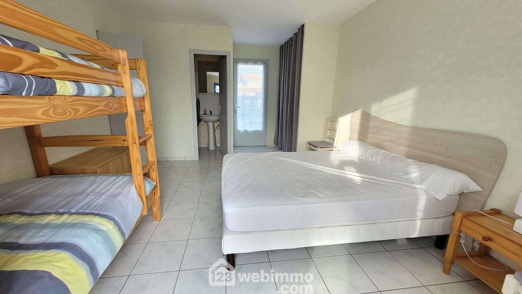 2 chambres, dont une avec lavabo et WC privatifs, une salle d’eau, un WC séparé et un garage.