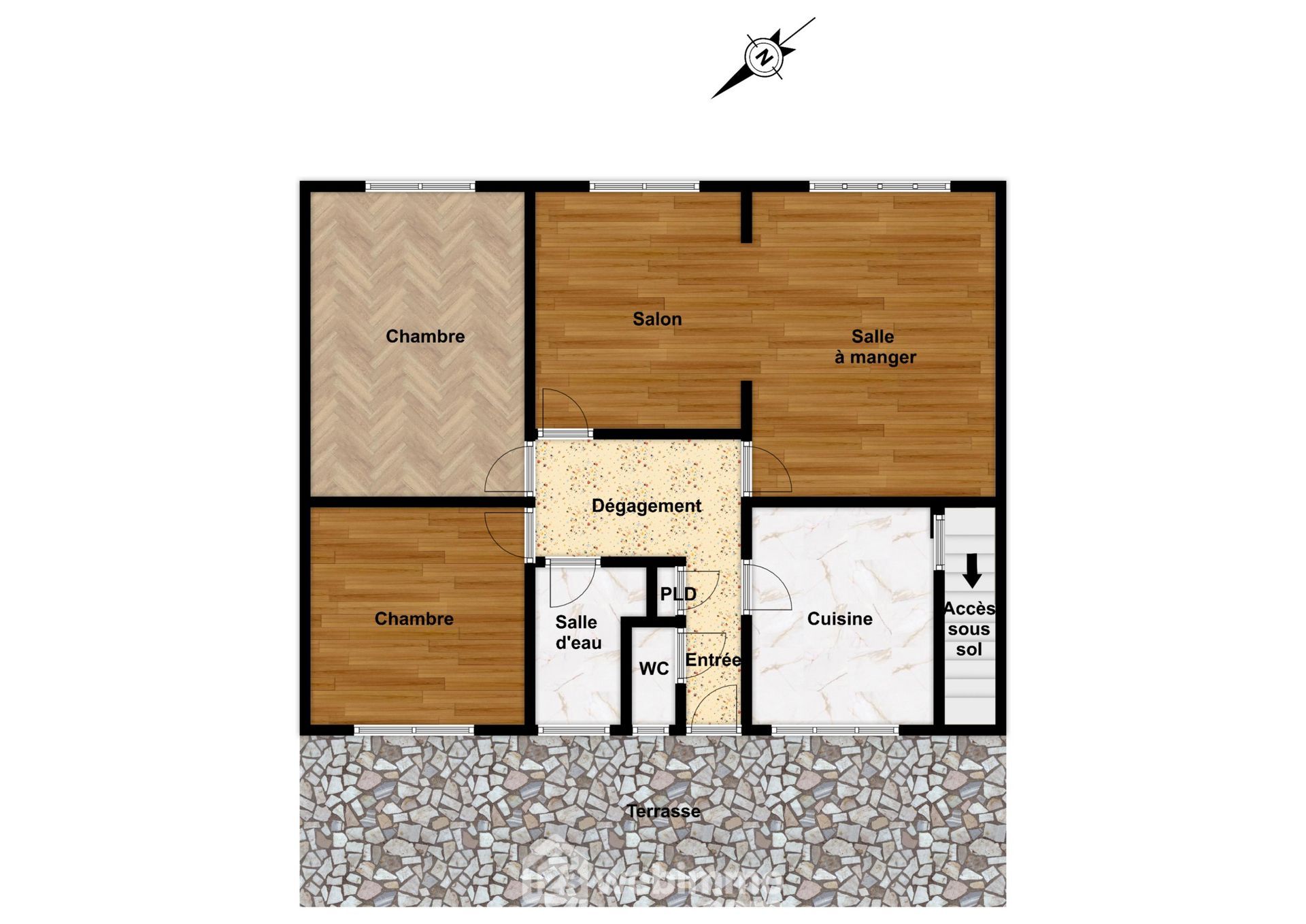 Maison sur sous-sol avec vie de plain-pied, 66 m2 habitables, 3 pièces, 2 chambres, double garage, cave, terrain de 2166 m2.