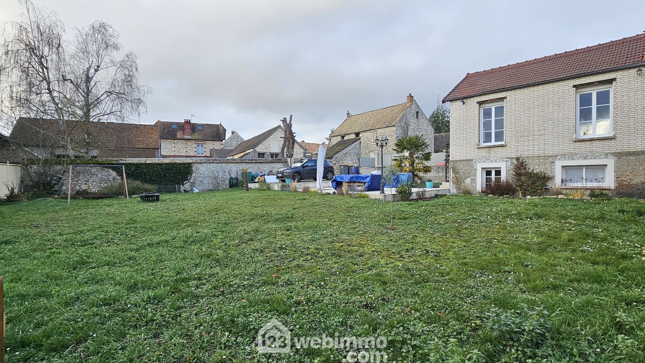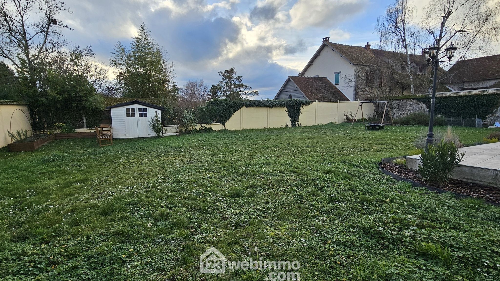 À l’extérieur, le jardin plat et clos de 602 m² constitue un véritable atout en cœur de village. La terrasse carrelée prolonge agréablement les espaces de vie, tandis que le garage attenant de 16 m² et le chalet offrent des solutions de rangement appréciables.