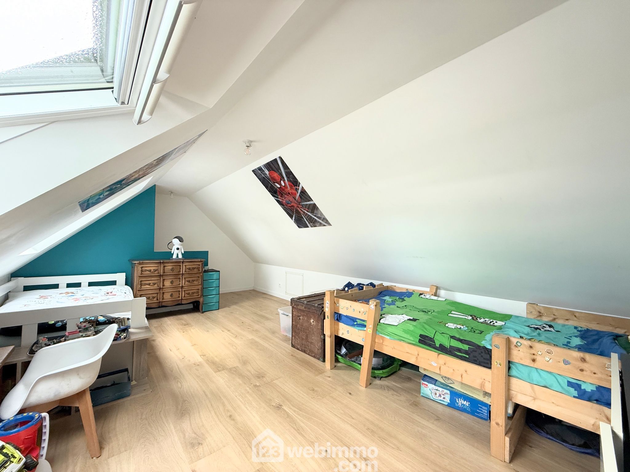 À l’étage, via deux escaliers distincts, vous accèderez à deux chambres mansardées de 12 et 19 m² au sol (7 et 8m² habitables).