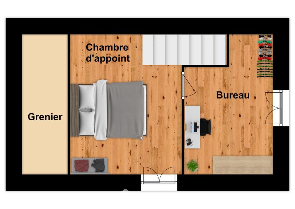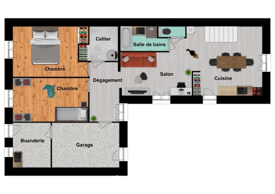 Maison avec vie de plain-pied, 75 m2 habitables, 4 pièces dont 2 chambres, terrain de 246 m2, raccordée à la fibre.