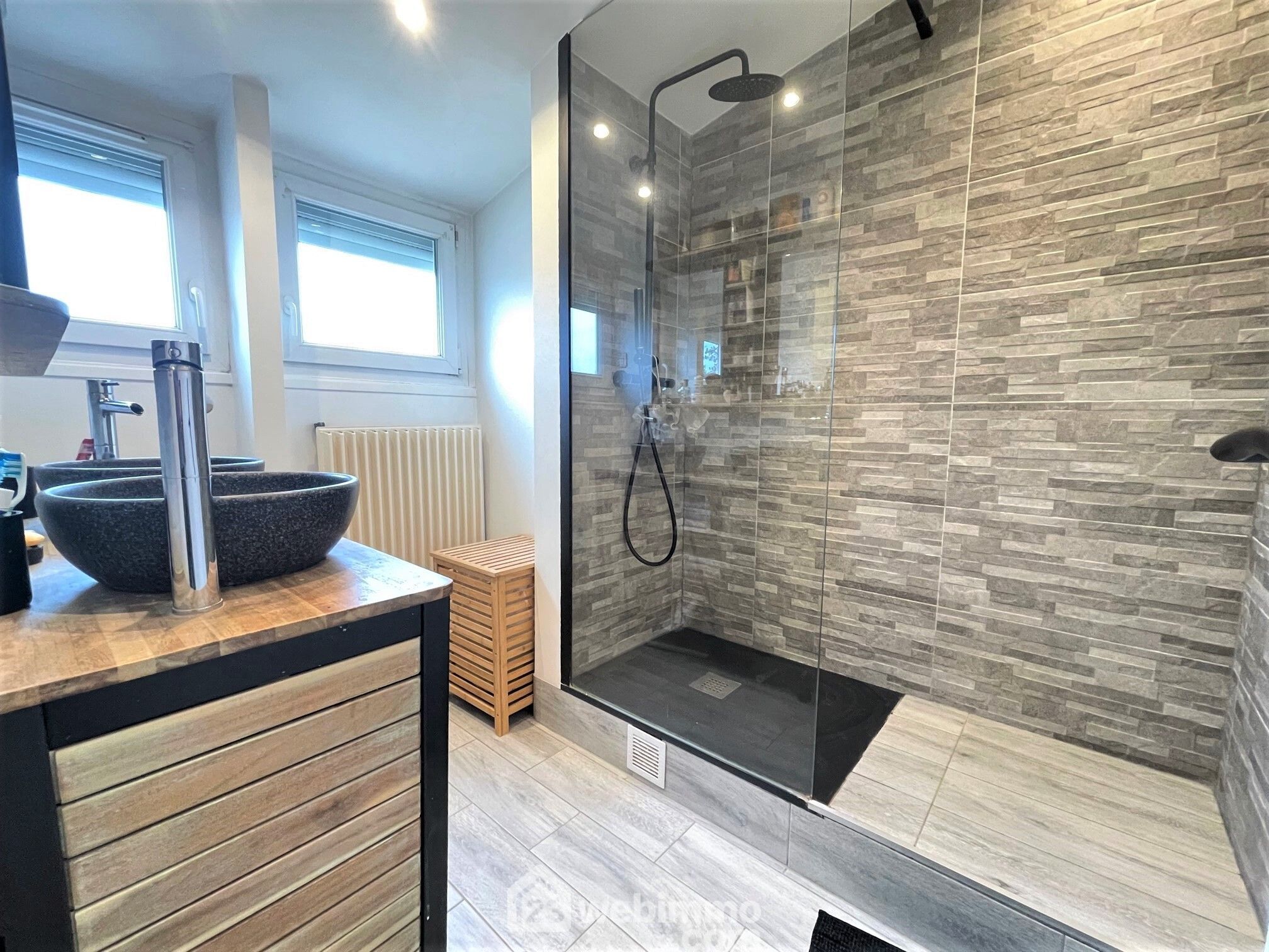 A l'étage: Palier avec placards, trois chambres avec placard, salle d'eau avec douche à l'italienne et double vasque, wc suspendu indépendant.