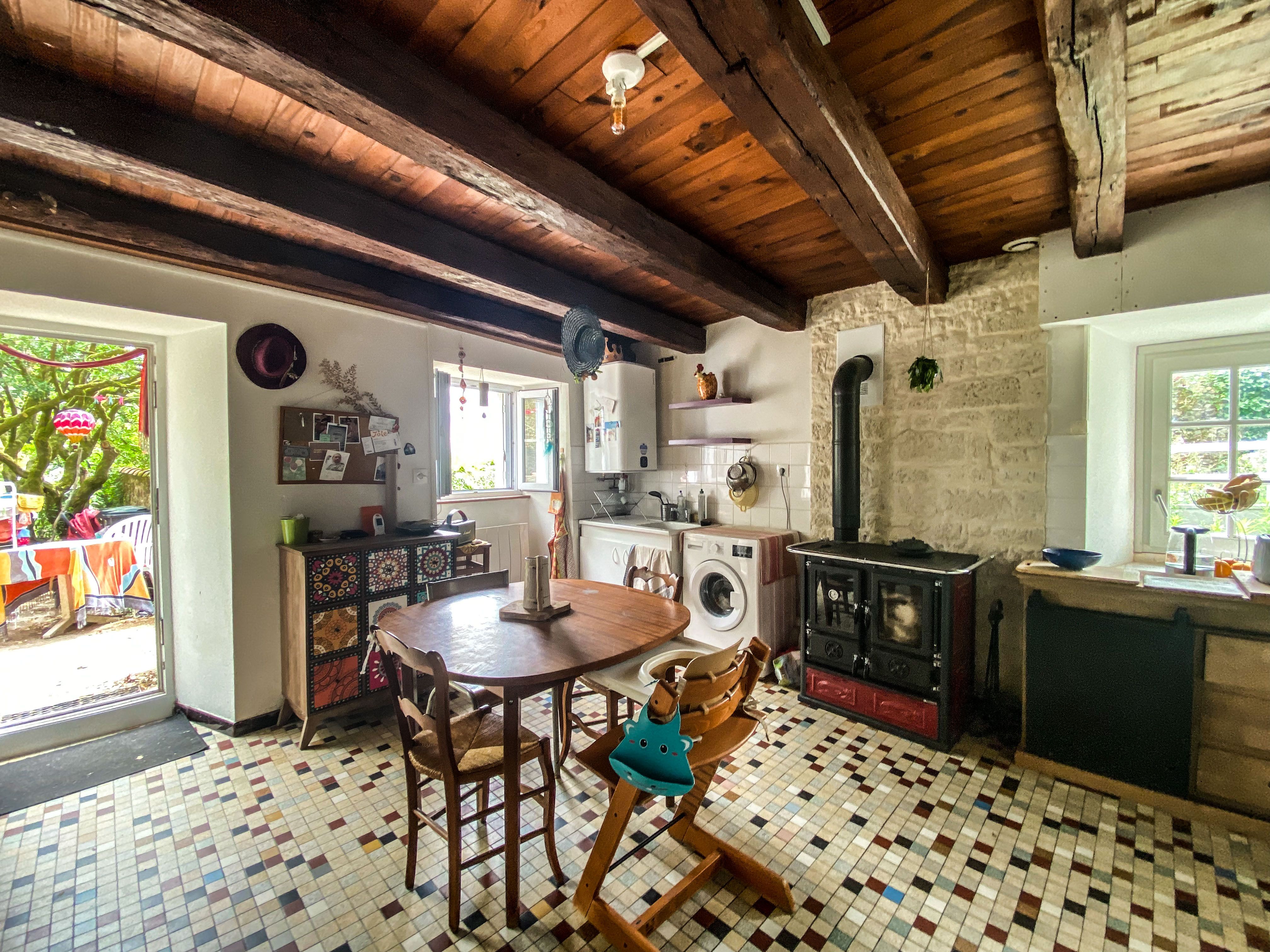 Idéalement située sur les hauteurs de Pouzauges, cette maison en pierre vous propose une cuisine ayant conservé le charme de l'ancien avec ses poutres apparentes et son poêle à bois.
