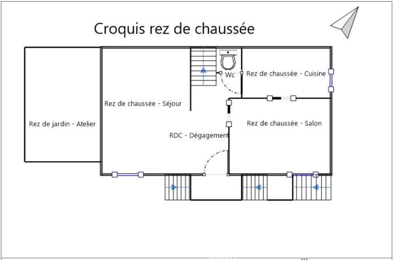 Le rez-de-jardin se compose d'un hall d'entrée de 5m2 ouvert sur un salon de 18m2, et desservant un espace séjour/salle à manger de 10m2 et une cuisine traditionnelle de 8m2. Un WC séparé sous l'escalier complète ce niveau.