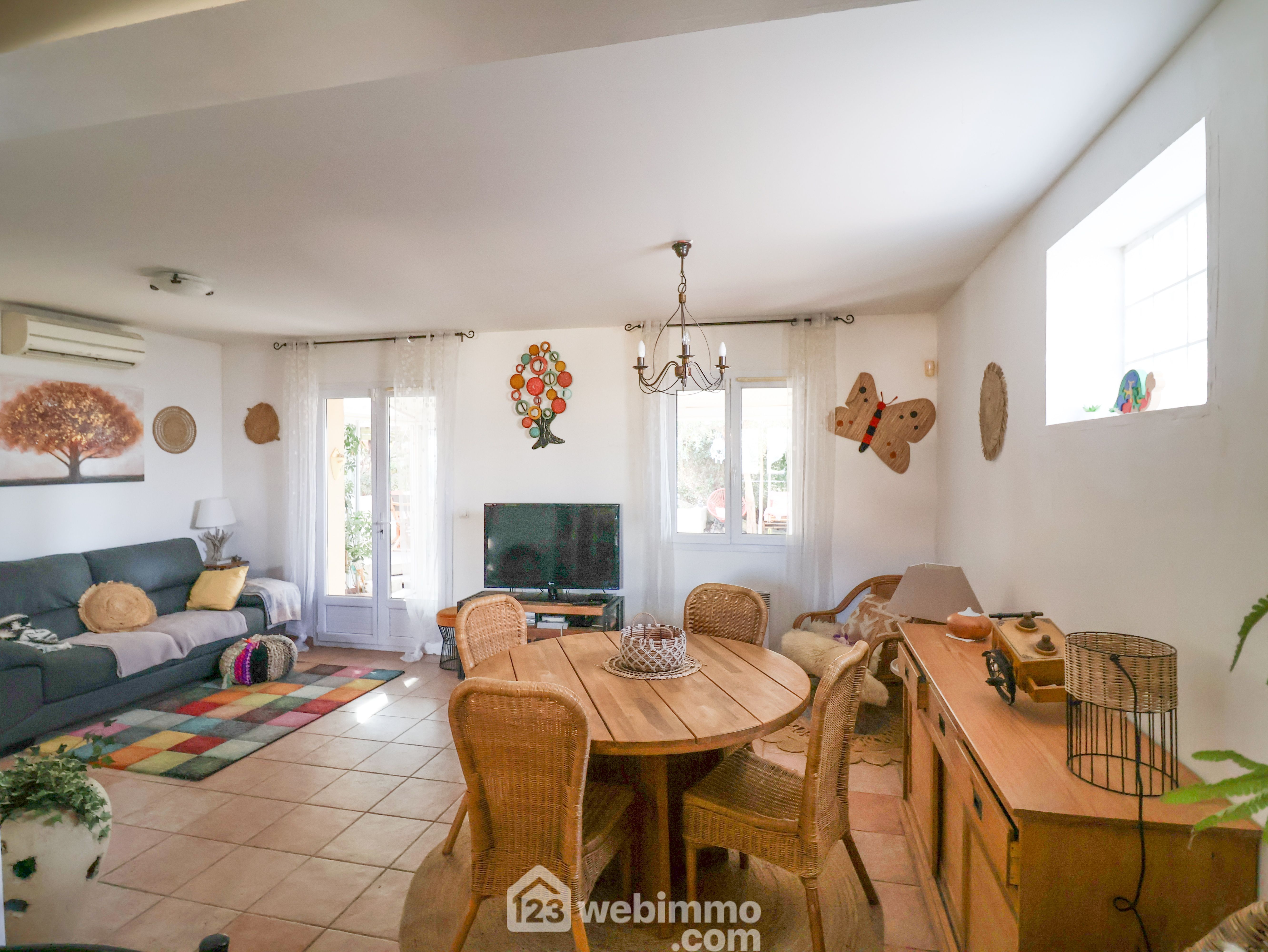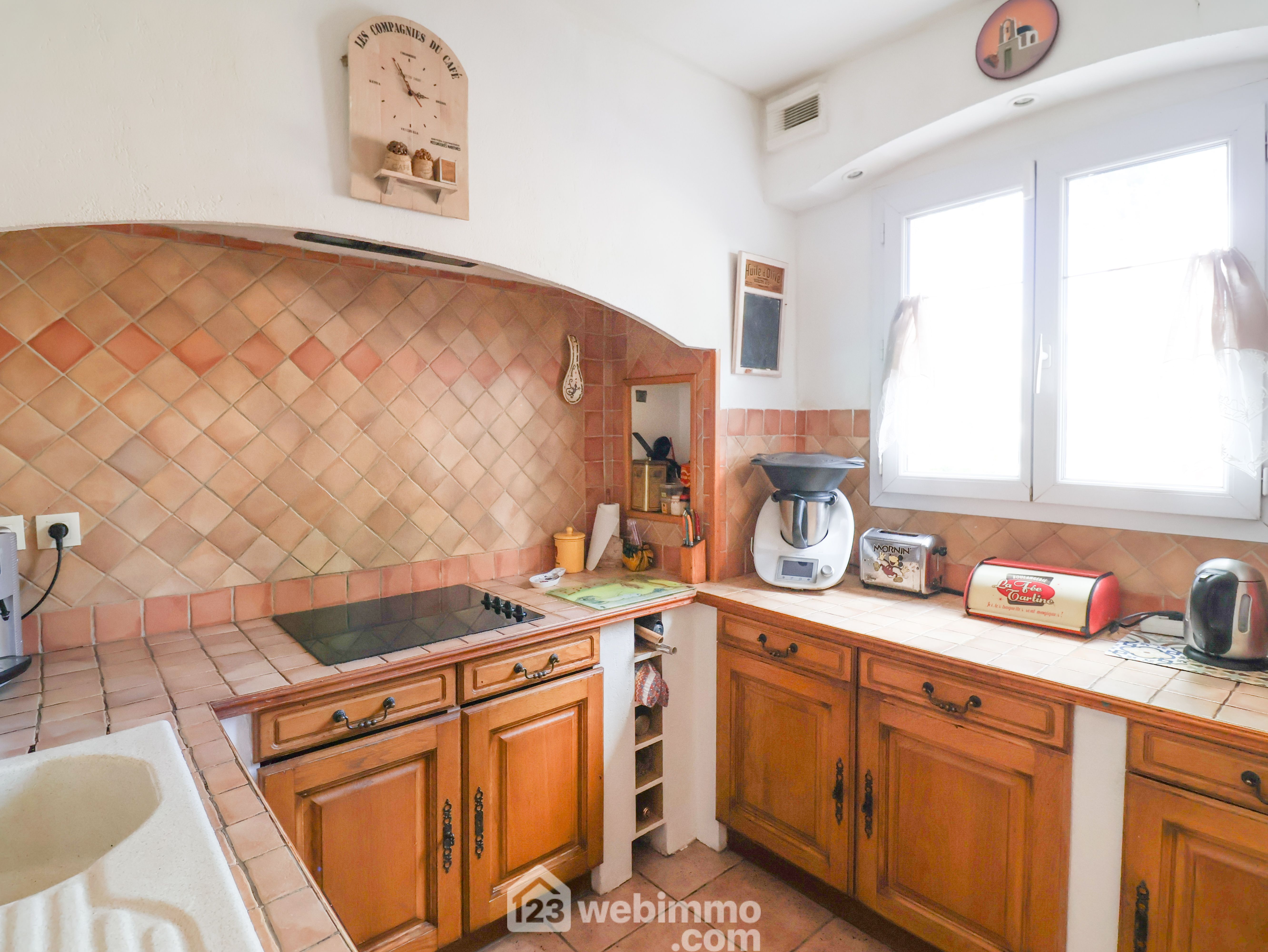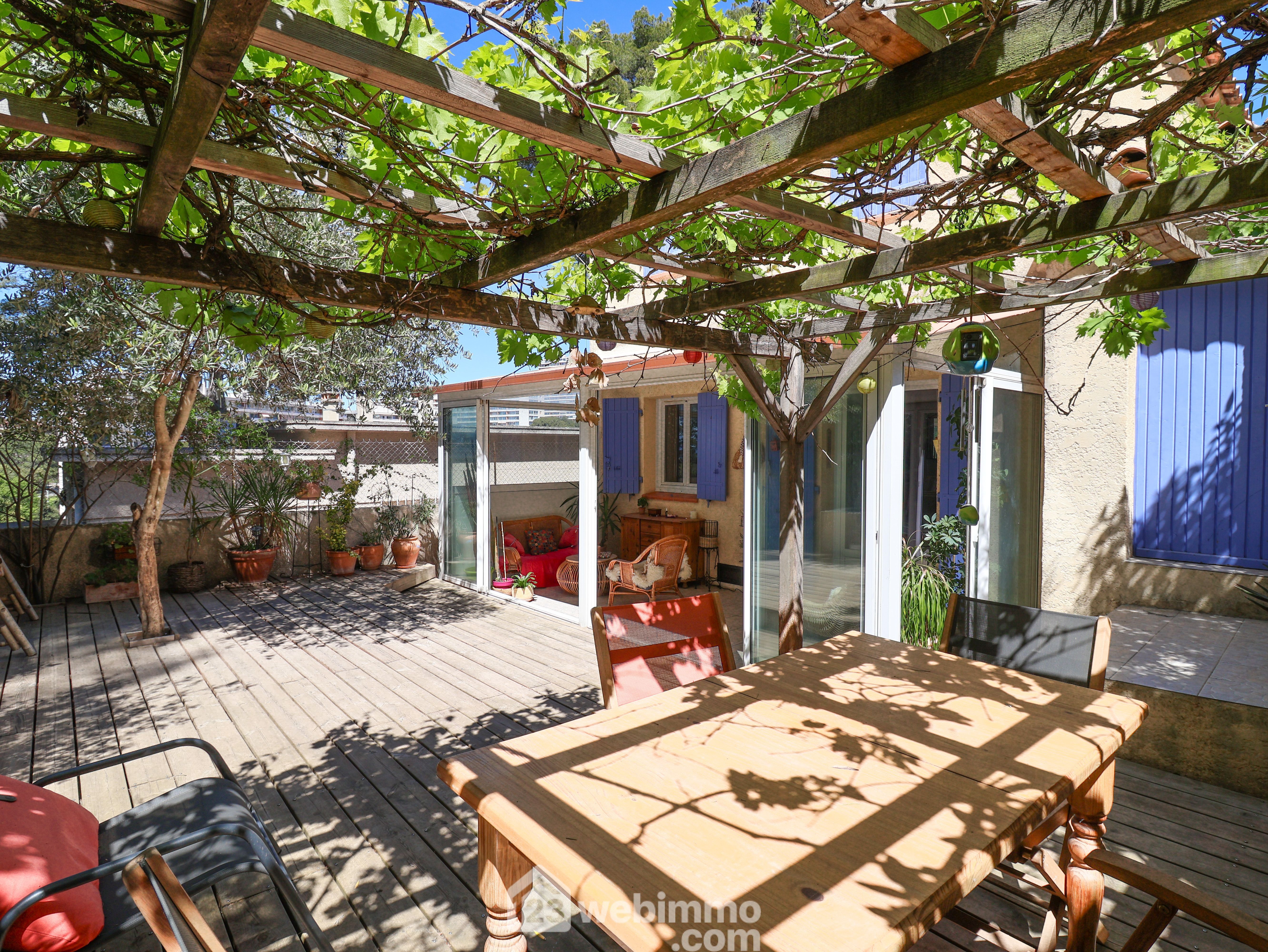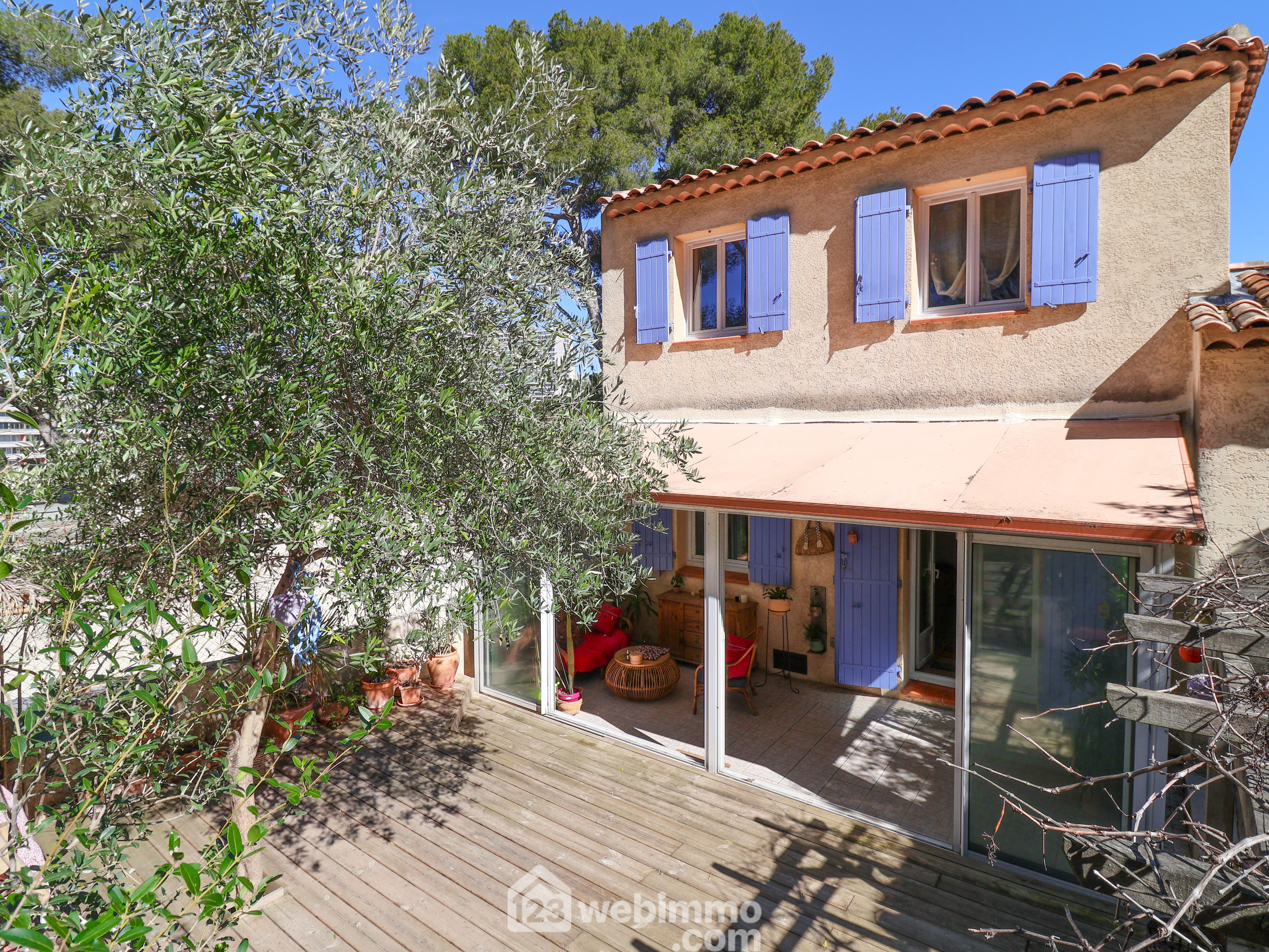 LE REDON côté Félibrige aux portes des Calanques au fond d'une impasse nichée dans la pinède au calme. Charmante maison de 2001 de type 4 de 80m2 avec garage sur un terrain de 200m2. Au premier niveau elle se compose d'un séjour cuisine de 31m2 prolongé par une véranda de 13m2 qui s'ouvre sur un vaste extérieur exposé OUEST duquel la vue sur la pinède vous séduira. A l'étage la partie nuit se compose de 3 chambres et d'une salle de bain. La mer s'aperçoit au travers de la pinède. A chaque niveau se trouve un wc séparé. Le garage attenant mesure 13m2, un 2ème véhicule peut être stationné devant le garage. Double vitrage, climatisation réversible dans le séjour. Cheminée avec insert. Accès facile à pied au Bus B1.