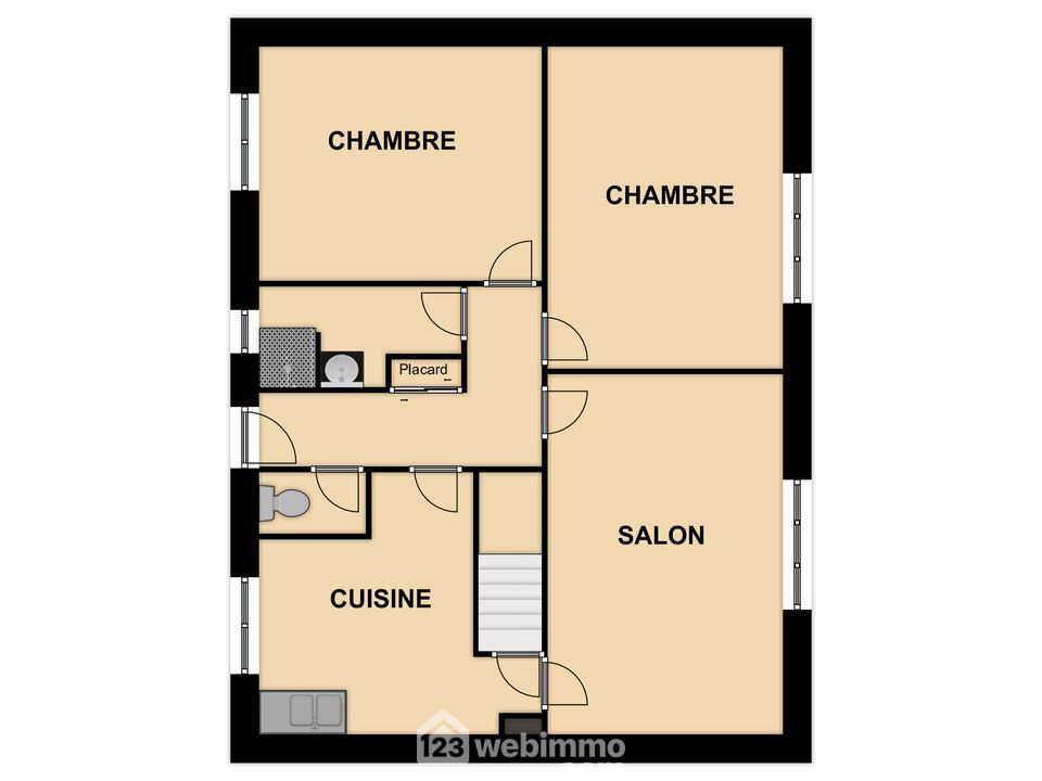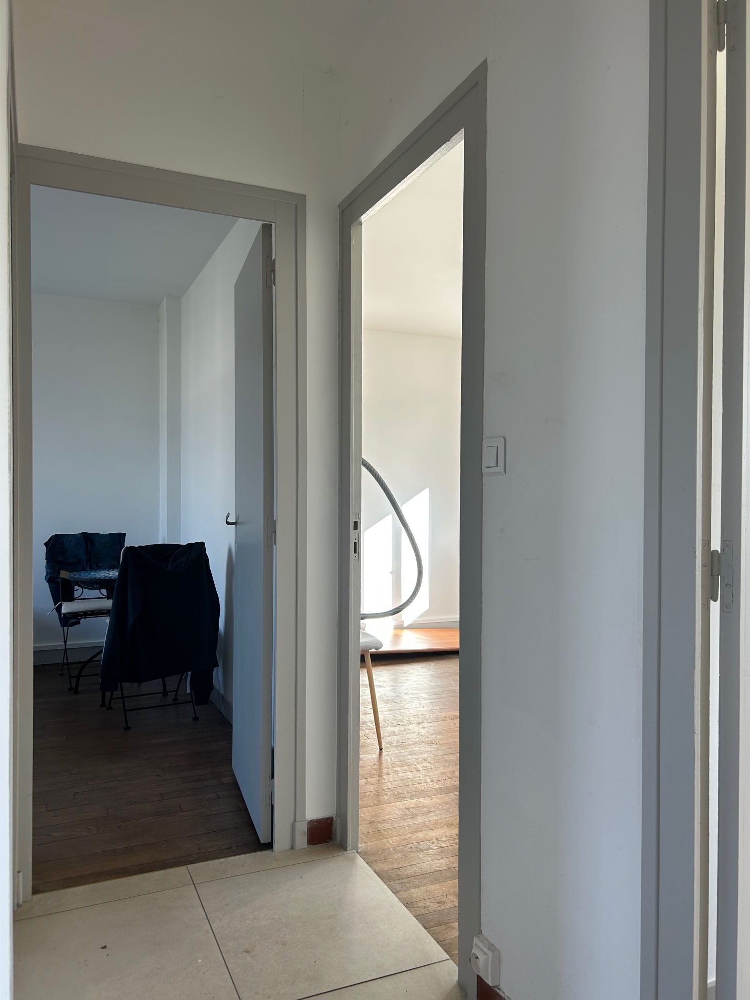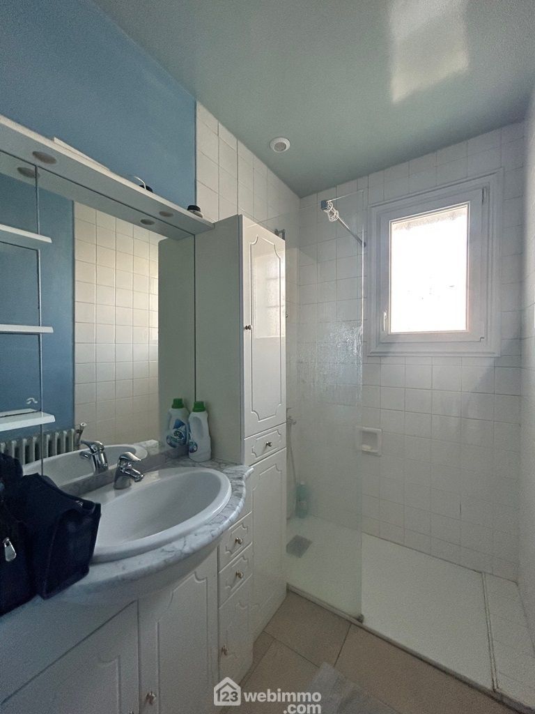 En demi-étage, entrée avec WC et placard, grande cuisine aménagée ouverte sur le séjour salon, salle d'eau avec douche à l'italienne récente, couloir, 2 grandes chambres sur parquet massif.