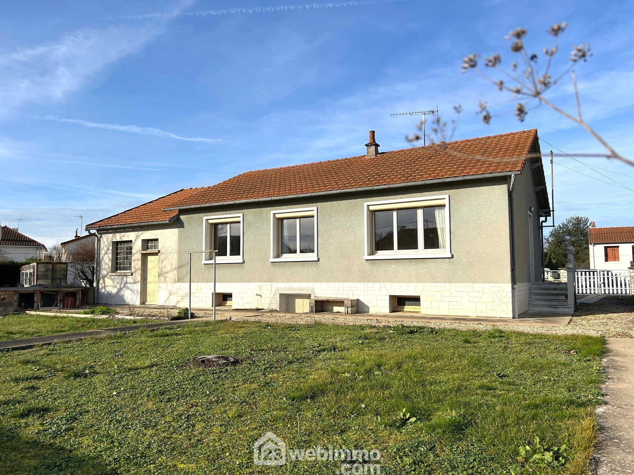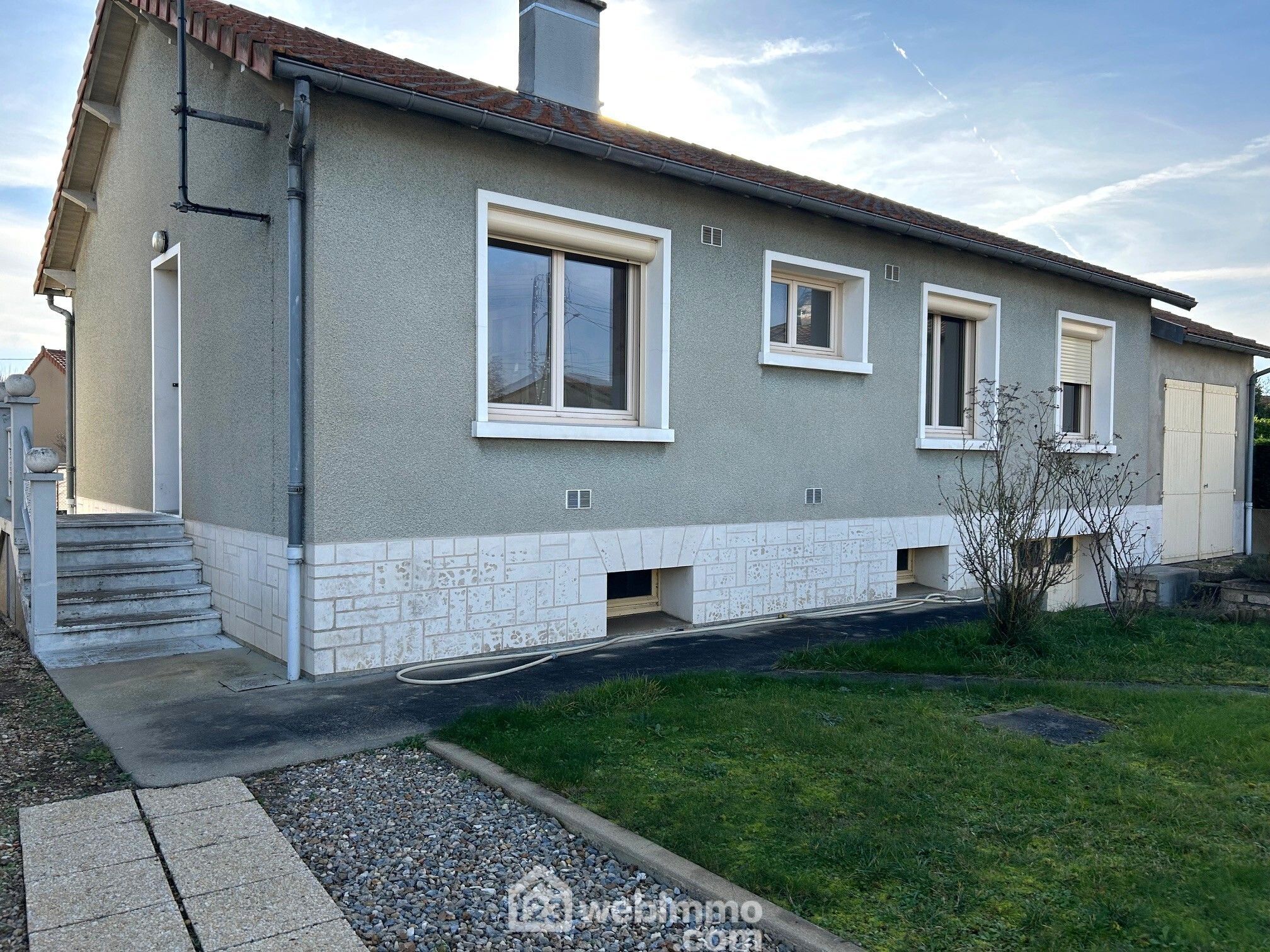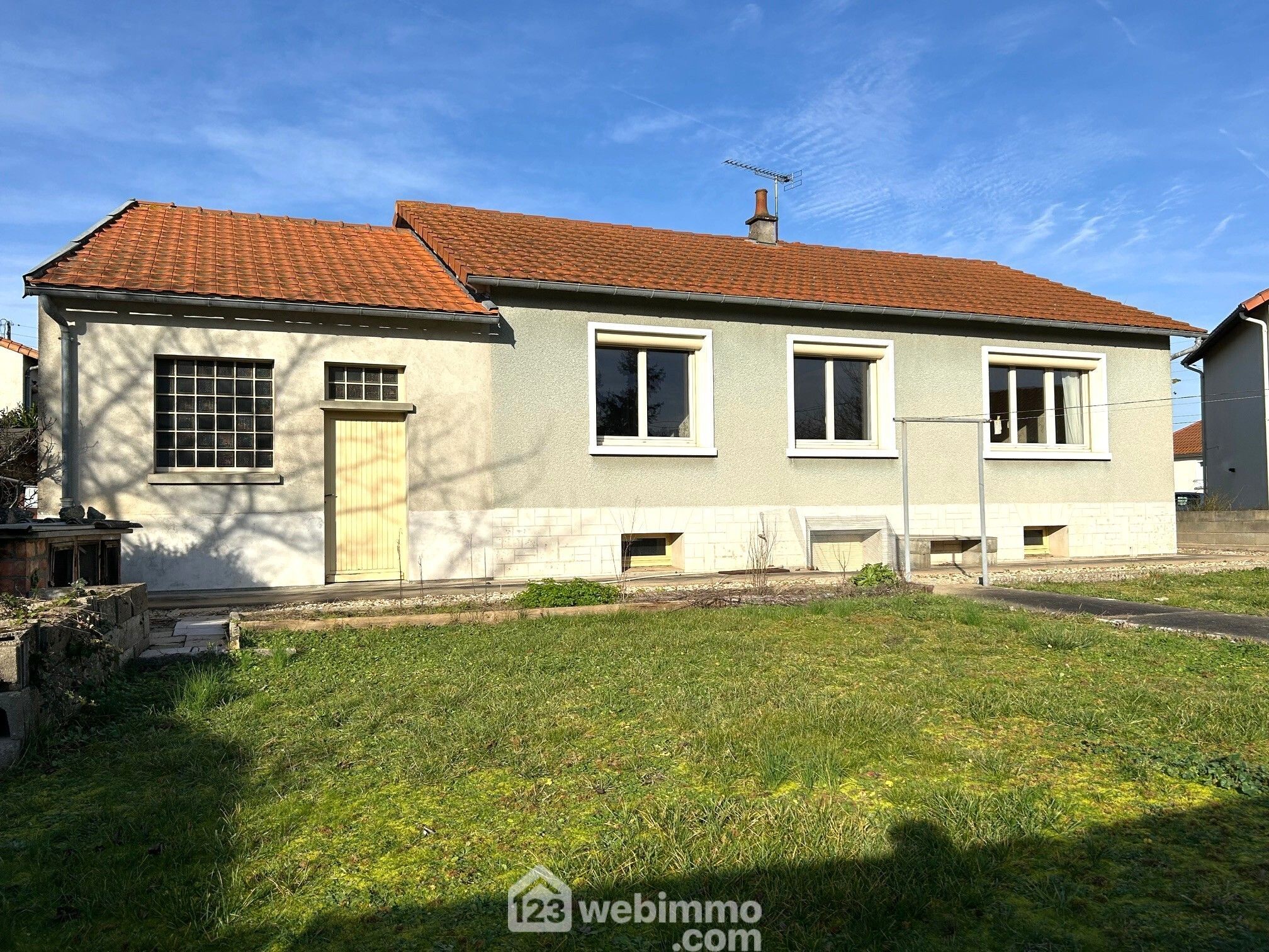 Maison indépendante, plain-pied surélevé, 81 m2 habitables, sous-sol aménageable, grand garage accolé sur terrain 636 m2 proche écoles.