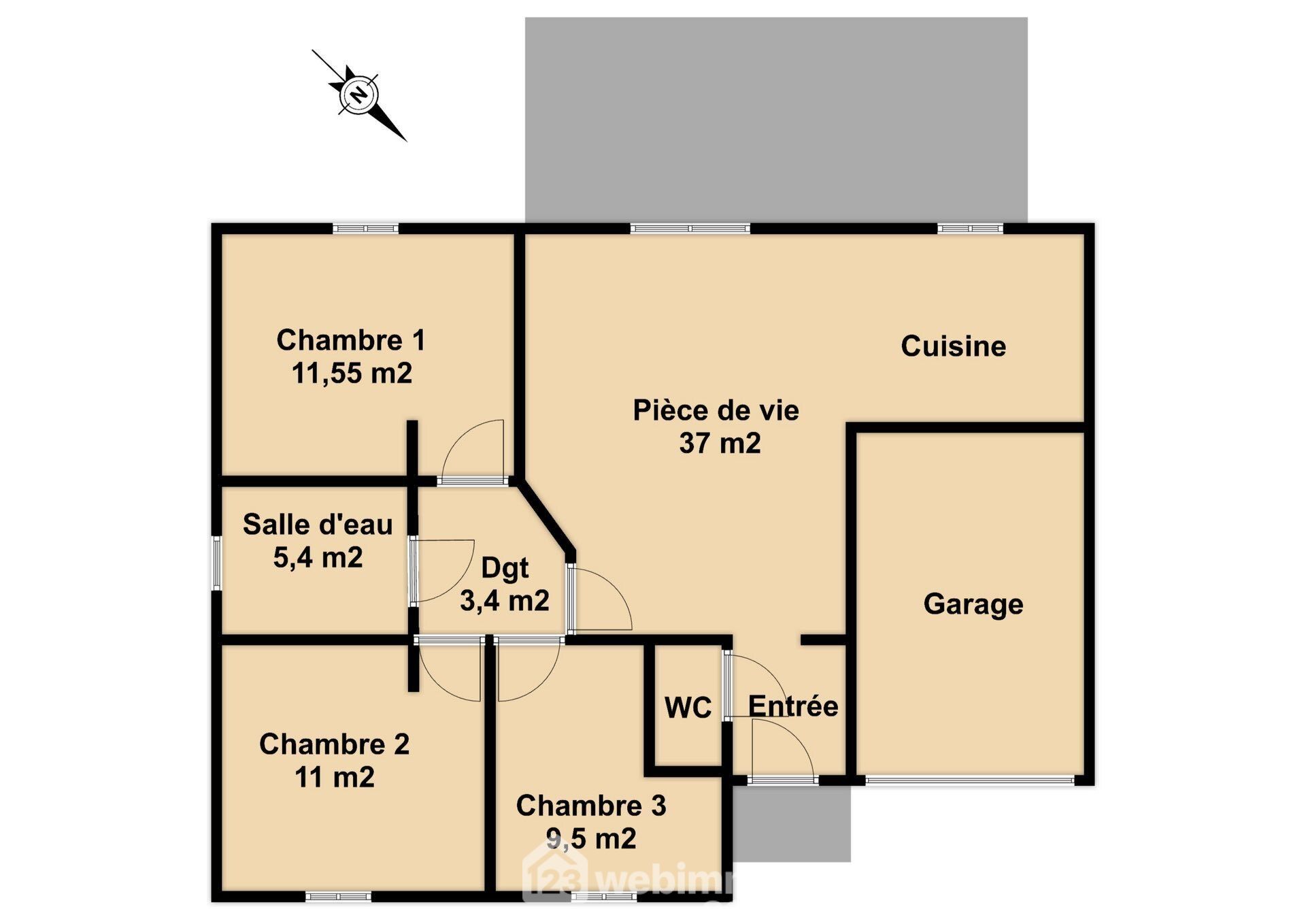 Pavillon plain-pied de 2014, 82 m2 habitables, 4 pièces, 3 chambres, garage, terrain de 499 m2.