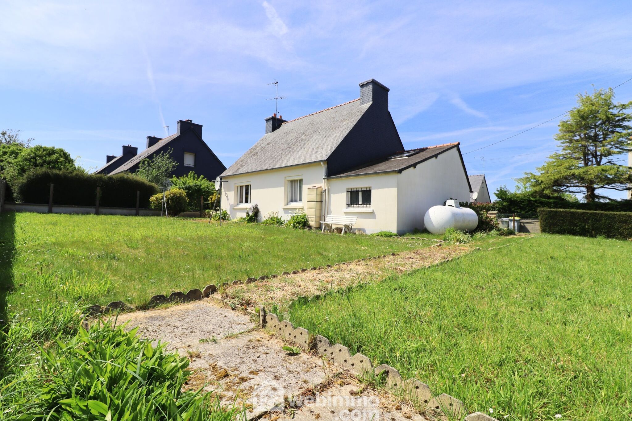Maison néo-bretonne de 87m2 avec 2 chambres de plain-pied sur un terrain constructible de 570m2, à 1,5km des plages et commerces.